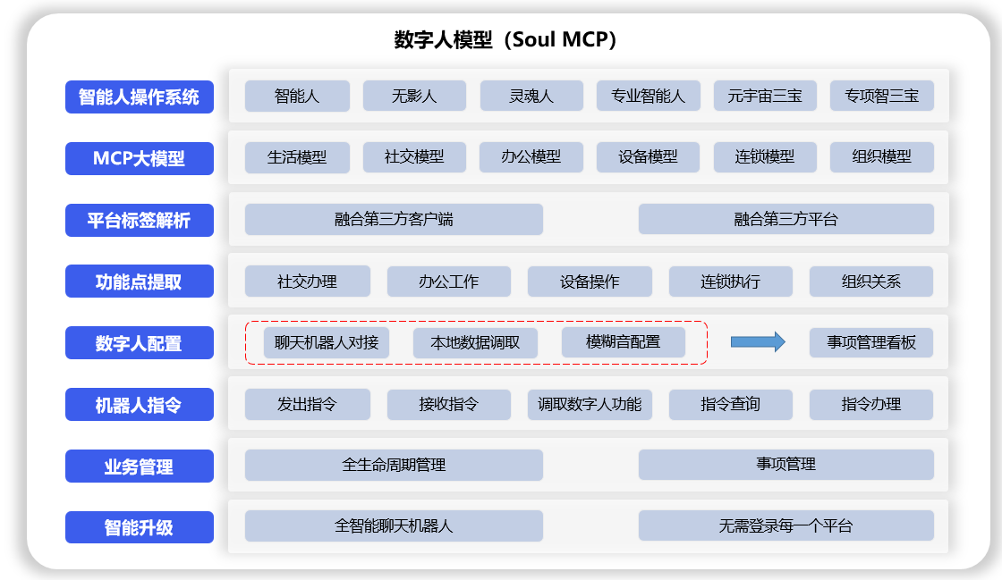 灵魂人智能模型协议(Soul Model Context Protocol),简称数字人(Soul MCP),是依托智能人操作系统构建的MCP大模型,通过对设备中融合过的客户端、平台进行标签解析,对社交办理、办公工作、设备操作、连锁执行和组织关系等数字人功能点提取,聊天机器人对接、本地数据调取、模糊音配置,自动生成事项管理看板。聊天机器人发出指令,数字人接收指令,自动调取数字人功能,在现实中代替自己编辑和查询各类文件,并对各类业务进行全生命周期管理和事项管理,自动升级为全智能聊天机器人,无需再登录每一个平台。