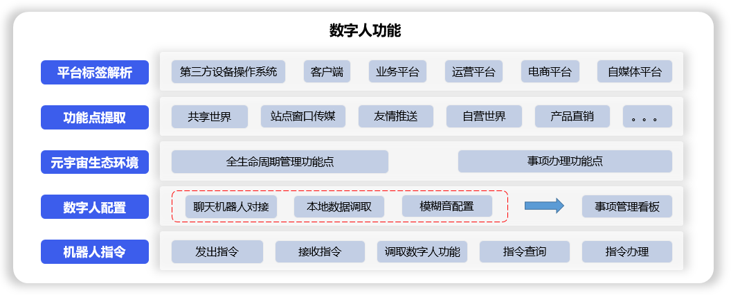 数字人MCP模型账户接口融合配置,上下游关系引用,通过对设备中融合过的客户端、平台进行标签解析,对指令办理、场景权限、共享工作、同屏会议、业务管理、平台共享、一键分享、项目运行等数字人功能点提取,下级功能点同步,设备操作点调取,聊天机器人对接,本地数据调取,模糊音配置,将现实自身能力映照到虚拟环境中。