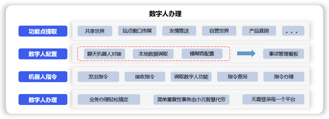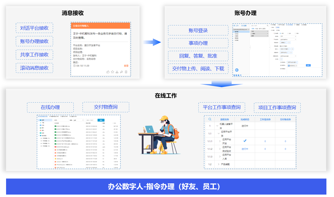聊天机器人发出平台、流程、功能点、工作项和交付物业务指令,办公数字人接收指令,自动生成事项办理功能点,代替你自动执行各类项目、办理各种事项。