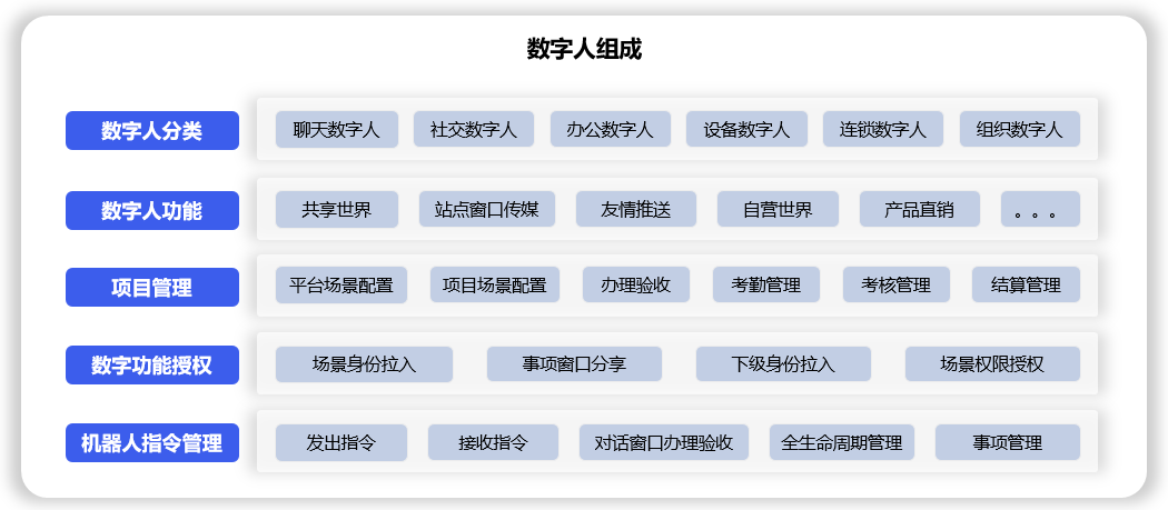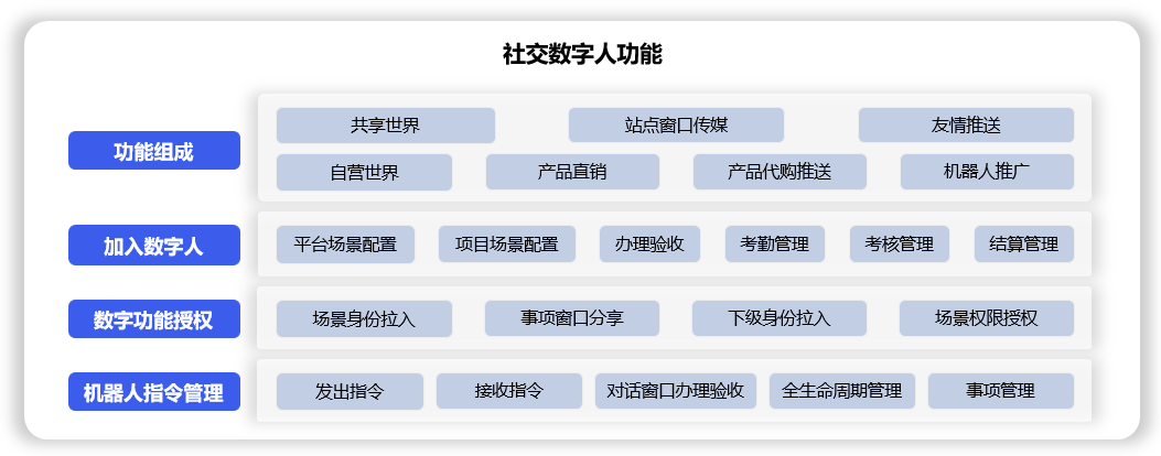 输入工作指令,自动生成身份、平台、专项、同屏、运营、智人、交付物、客服等管理功能点,数字人代替自己进行社交、工作,完成办理、验收、执行、结算等业务事项。