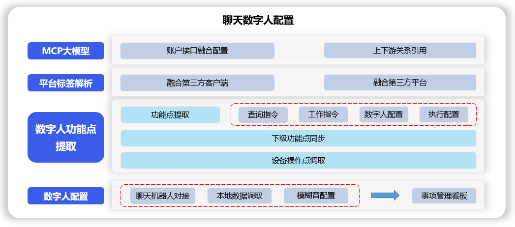 数字人MCP模型账户接口融合配置,上下游关系引用,通过对设备中融合过的客户端、平台进行标签解析,对查询指令、工作指令、数字人配置、执行配置等数字人功能点提取,下级功能点同步,设备操作点调取,聊天机器人对接,本地数据调取,模糊音配置,将现实自身能力映照到虚拟环境中。