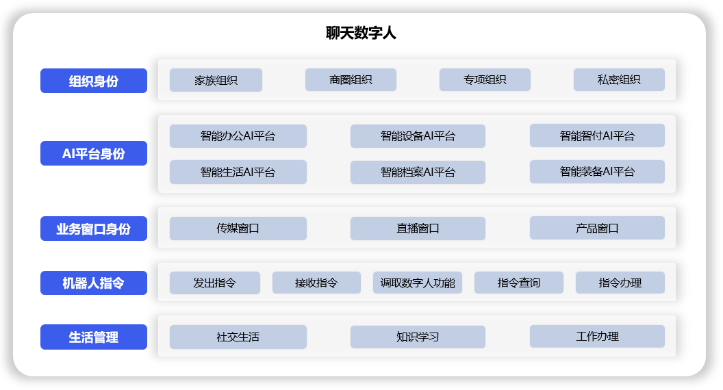 聊天数字人自带的组织身份、AI平台身份、业务窗口身份和聊天机器人形成去中心化的身份共享生态,现实关系映照。