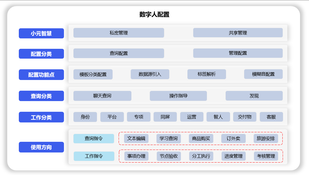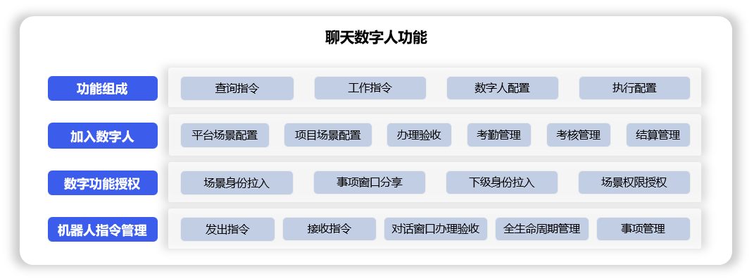 聊天数字人功能由4个分类(查询指令、工作指令、数字人配置、执行配置)组成,用于: