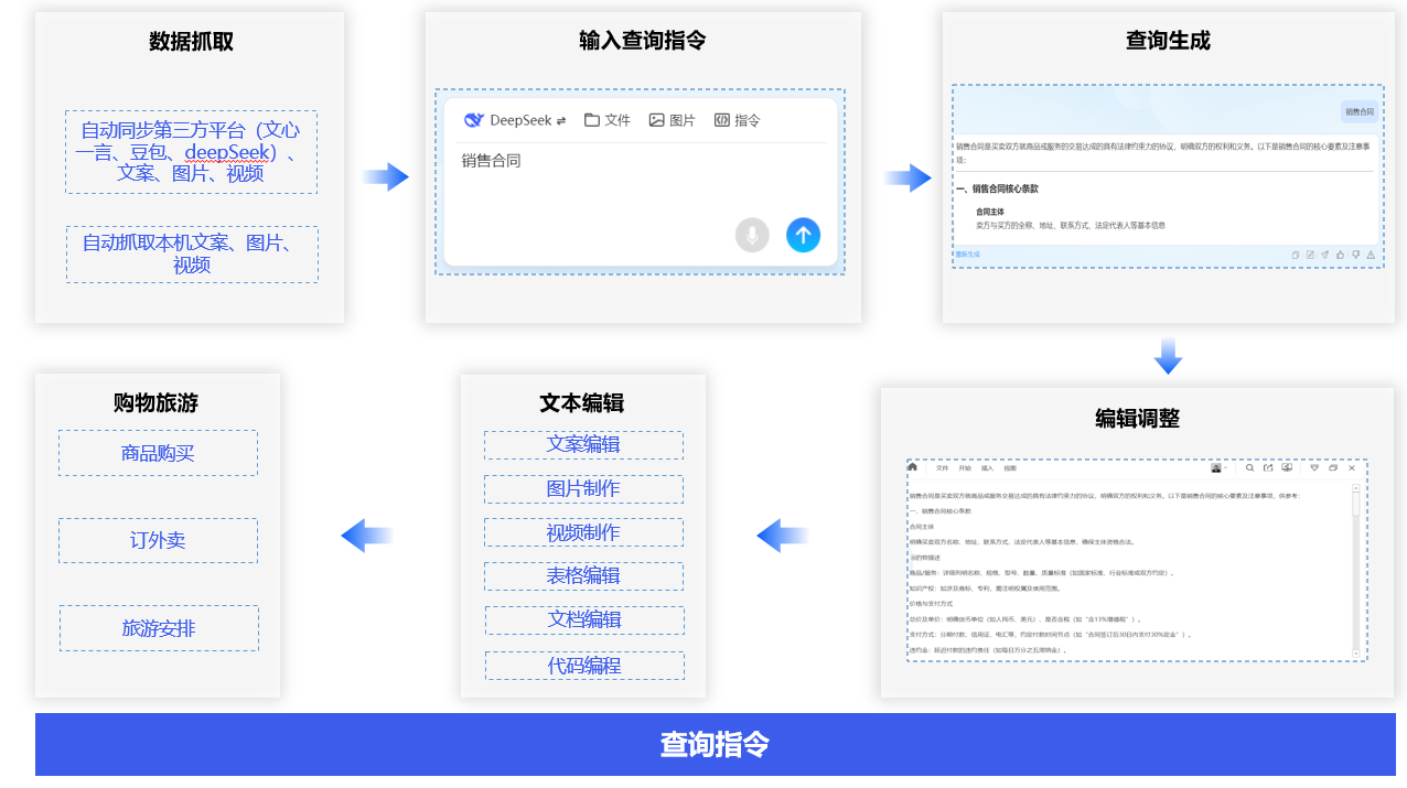 输入查询指令,数字人代替你快速生成您想要的文案、视频、表格、代码等文本内容,一键查询所有商品、外卖、旅游等,实现跨平台下单。