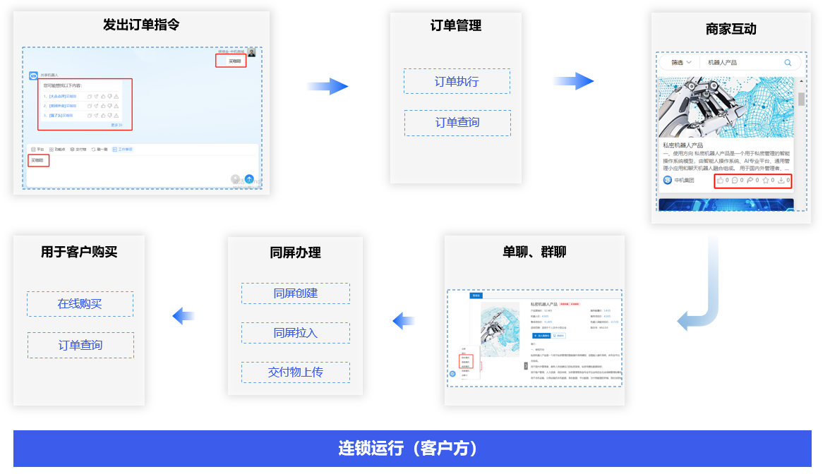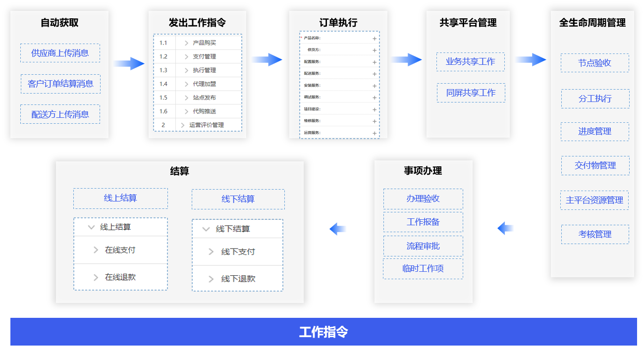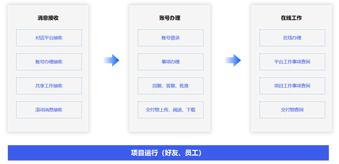 好友和员工通过消息接收、消息办理、节点验收、分工执行、进度管理、交付物管理、主平台资源管理、考核管理、事项查询等操作,以体验跨身份、跨平台、跨环境的在线业务管理。