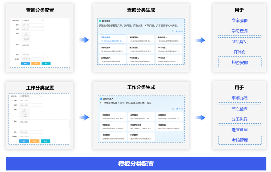 根据查询指令、工作指令等模板分类,录入自己的模板分类数据,生成自己的查询和工作模板分类模型,与外部共享,能够根据查询指令一键生成自己需要的文案、表格、视频等内容,根据工作指令一键生成管理功能点,代替自己进行社交、工作和完成办理、验收、执行等业务事项。