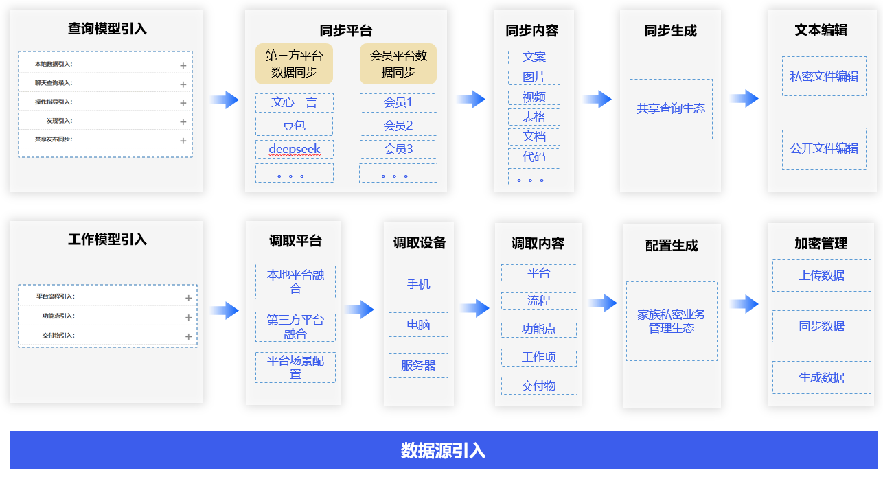 通过小元智慧,同步学习文心一言、豆包、DeepSeek和其他会员等的文案、表格、视频、代码等共享数据,自动生成我的共享查询生态,一键生成自己想要的各类文件。自动融合,抓取自己和家族成员手机、电脑、服务器中的平台、流程、功能点、工作项和交付物等数据,生成自己的家族私密业务管理生态,对所有上传、同步和生成数据进行加密管理。
