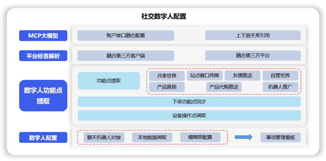 数字人MCP模型账户接口融合配置,上下游关系引用,通过对设备中融合过的客户端、平台进行标签解析,对共享世界、站点窗口传媒、友情推送、自营世界、产品直销、产品代购推送、机器人推广等数字人功能点提取,下级功能点同步,设备操作点调取,聊天机器人对接,本地数据调取,模糊音配置,将现实自身能力映照到虚拟环境中。