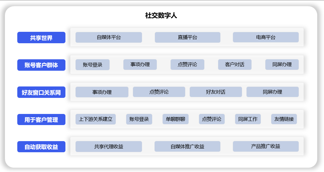 社交数字人自带的购物和娱乐平台+账号客户群体+推送窗口关系网,构成了自己的共享世界社交生态。