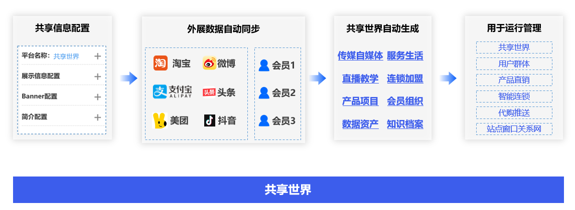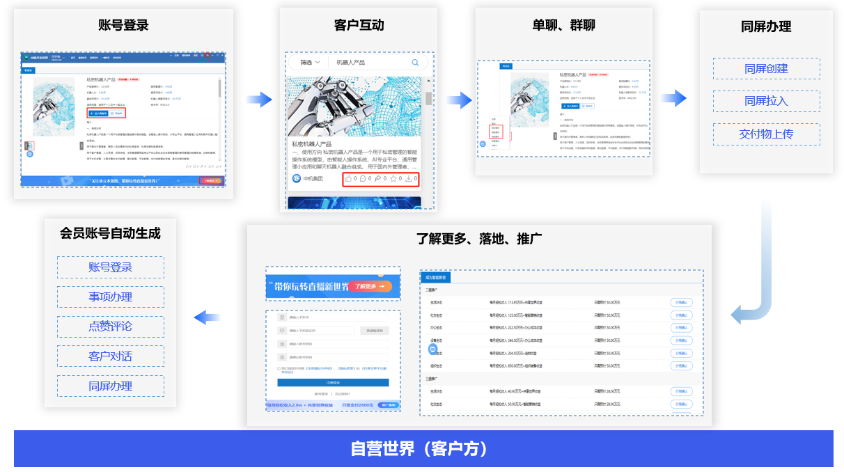 录入用户名称、手机号等基本信息,自动生成共享世界社交生态,你将会拥有一个属于自己的共享世界体验中心,用于管理自己的共享世界、客户群体、产品直销、智能连锁、代购推送、知识学习、站点窗口关系网。