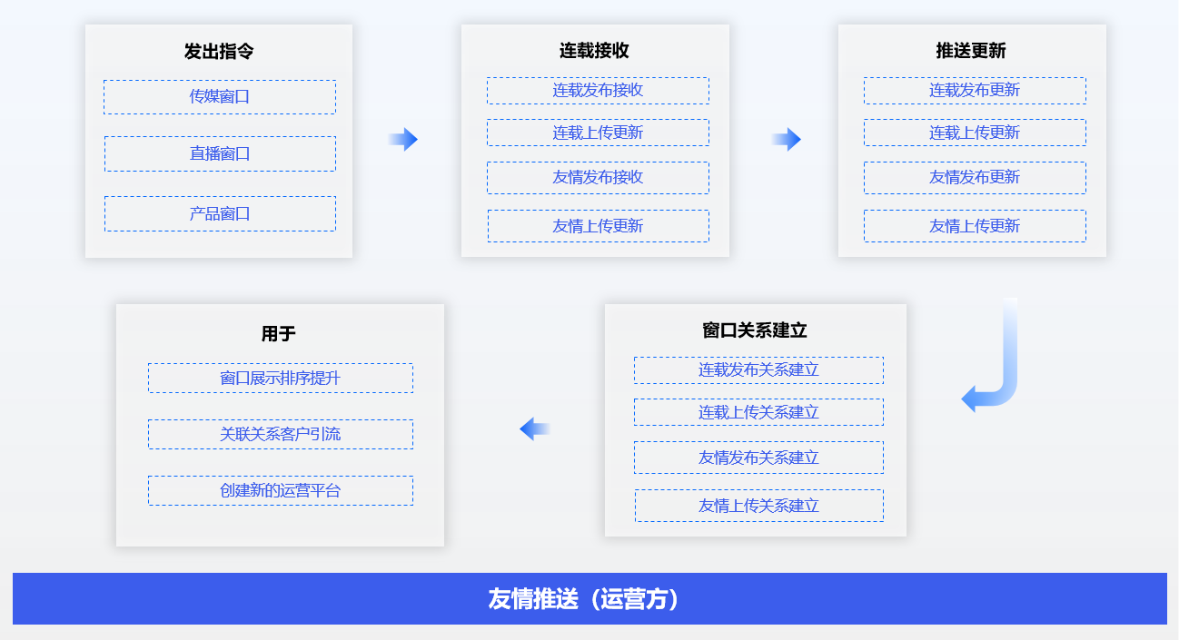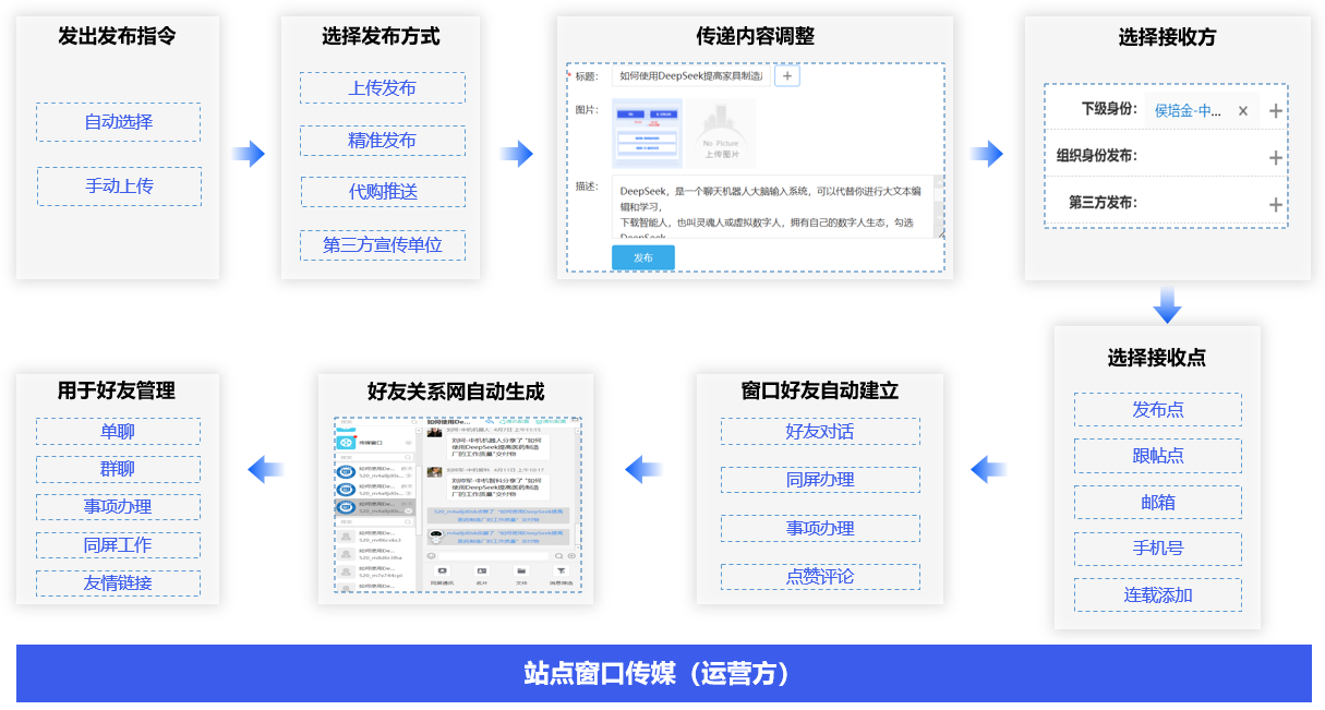 通过传媒、直播、产品交付物的连载发布、上传,友情发布、上传,自动建立了发布人与接收人的对话窗口关系,每一个对话窗口可以直接用于创建新的运营平台、关联关系客户引流、提升窗口展示排序。