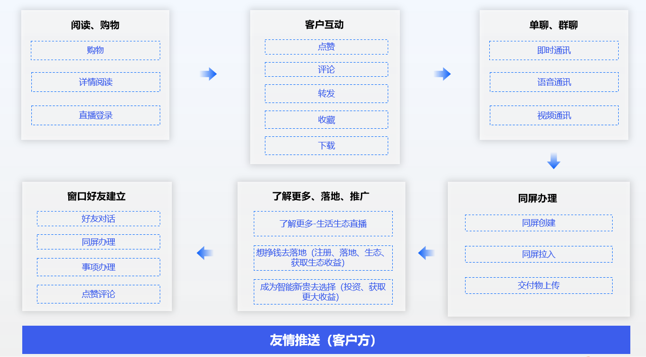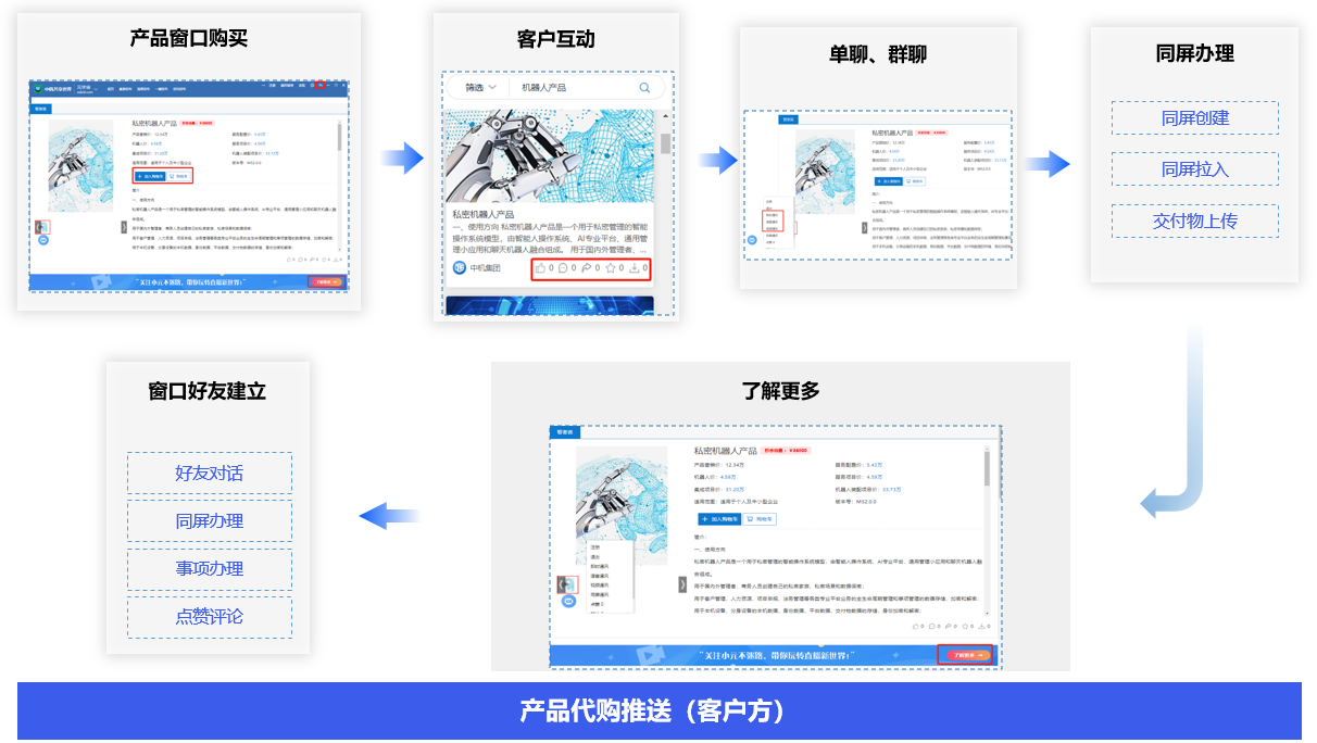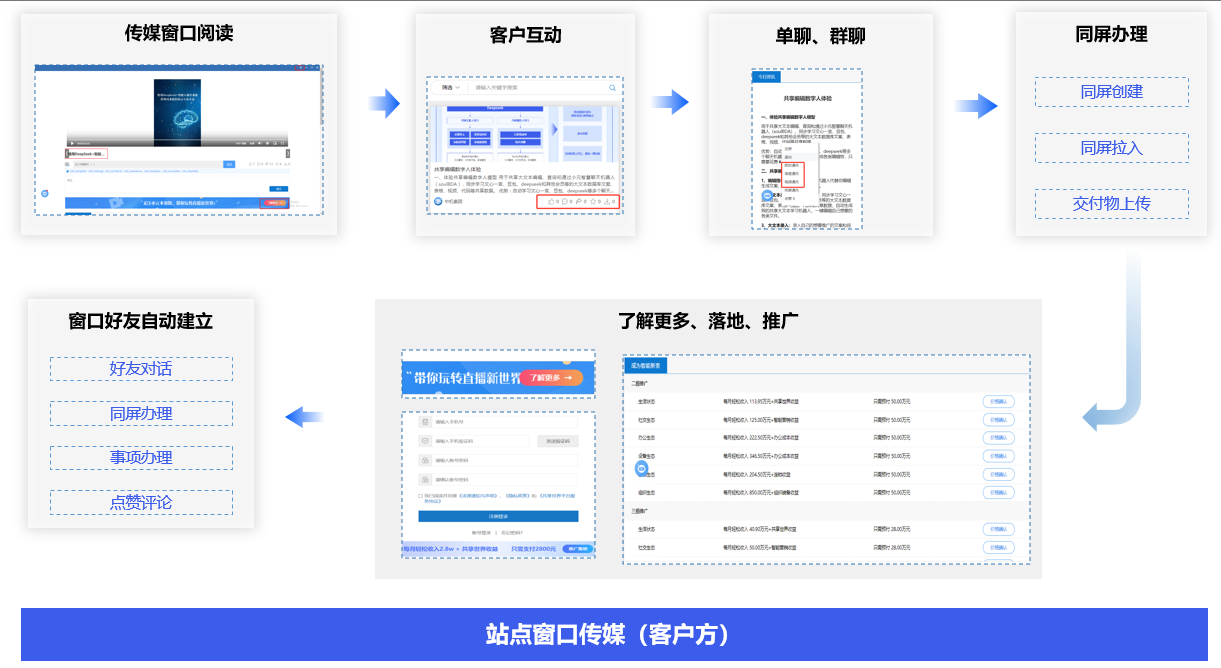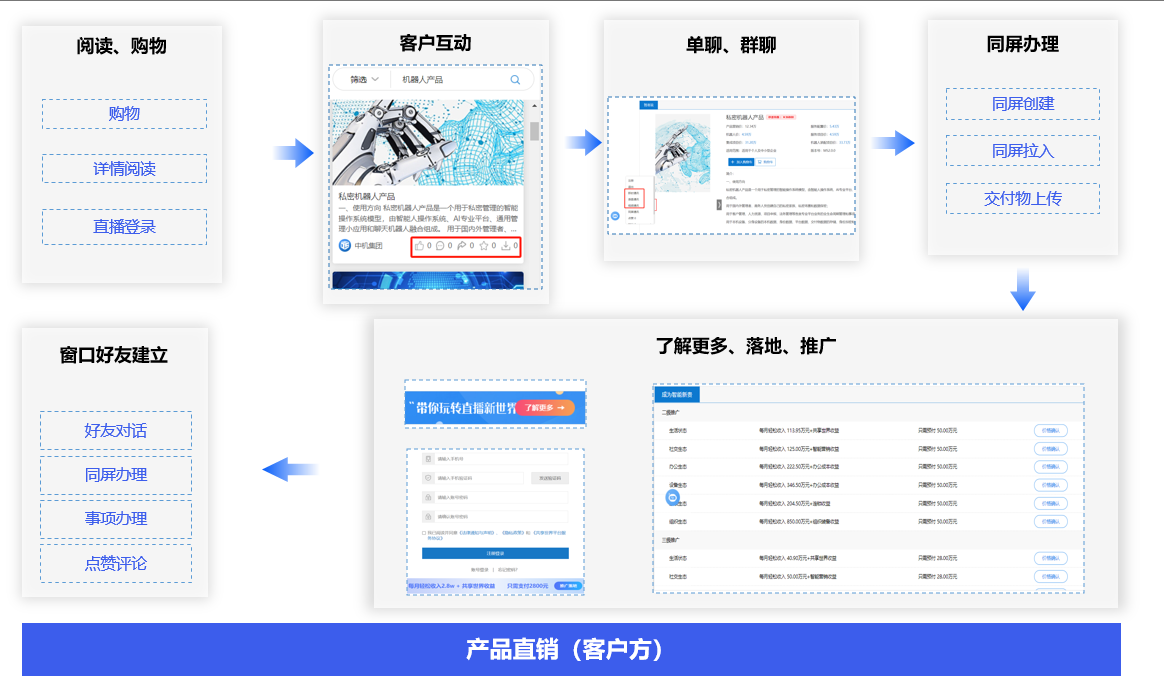 客户通过交付物窗口,进行传媒阅读、直播登录、产品购买,与发布方点赞、评论互动,单聊、群聊,同屏对话,还可以了解更多、推广落地,获取产品直销推广收益。