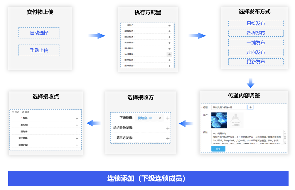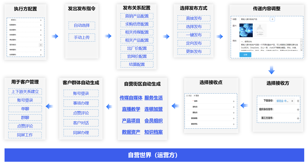 下级连锁成员同步上级传媒、直播、产品交付物,配置执行方,自动精准发送给好友、账号客户群体。