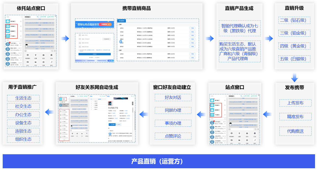 通过传媒、直播、产品交付物携带直销产品落地,同时关联中间商等级收益,自动形成直销窗口关系网,生成自己的直销平台,下级组织和客户群体。