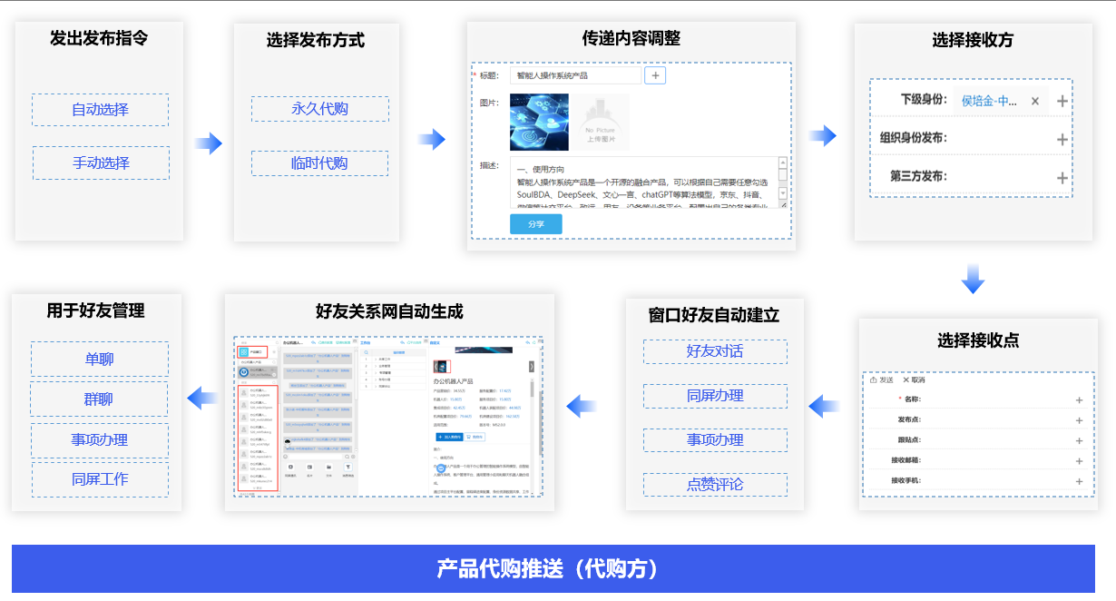 勾选代购客户需要的产品,通过微信、qq等通讯平台分享给客户,自动生成好友窗口关系网,通过交付物事项窗口与好友进行单聊、群聊、事项办理、同屏工作。