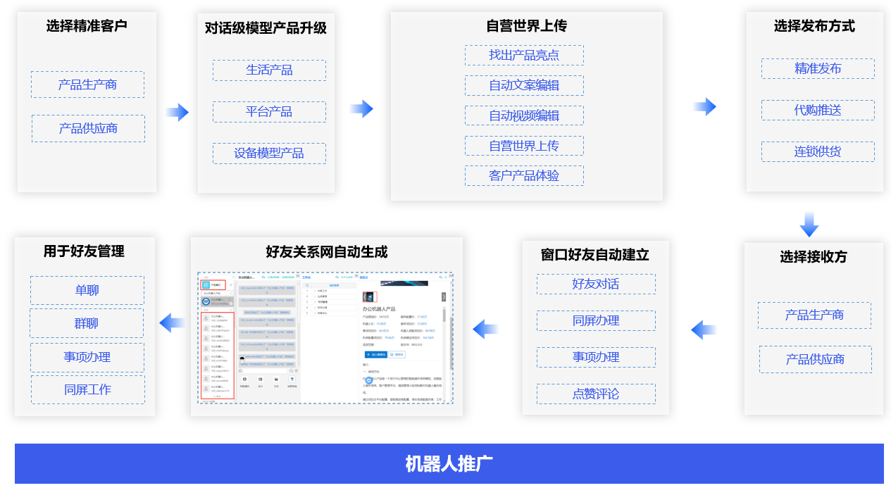 机器人推广不是产品营销,精准选择产品生产商和供应商,将其产品升级为对话级模型产品,再找出升级后的产品亮点,通过聊天机器人对推广产品进行文案、视频编辑。上传到共享世界用于客户了解和体验,同时还可以直接通过精准发布、代购推送、连锁供货,直接发送给产品生产商和供应商。