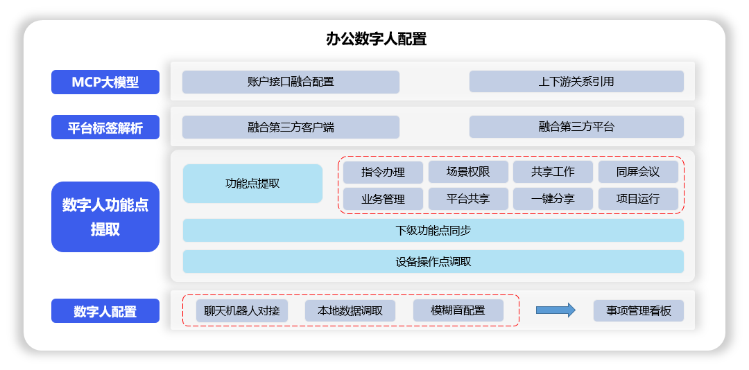 数字人MCP模型账户接口融合配置,上下游关系引用,通过对设备中融合过的客户端、平台进行标签解析,对指令办理、场景权限、共享工作、同屏会议、业务管理、平台共享、一键分享、设备运行等数字人功能点提取,下级功能点同步,设备操作点调取,聊天机器人对接,本地数据调取,模糊音配置,将现实自身能力映照到虚拟环境中。