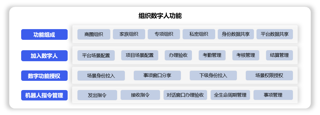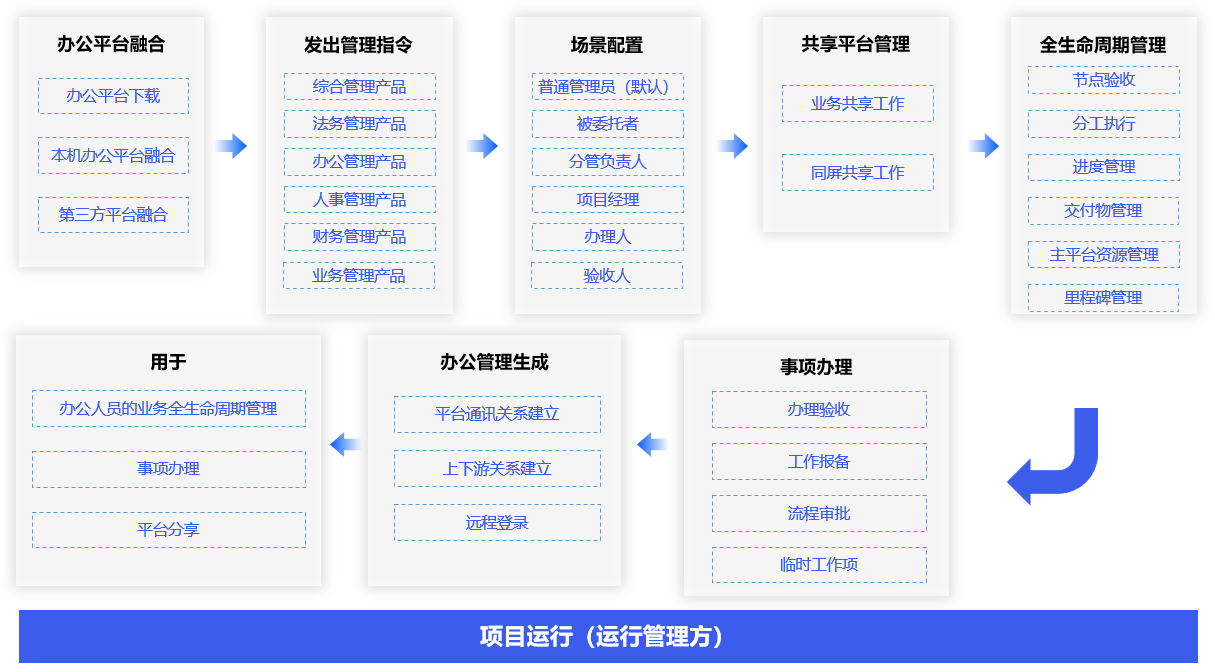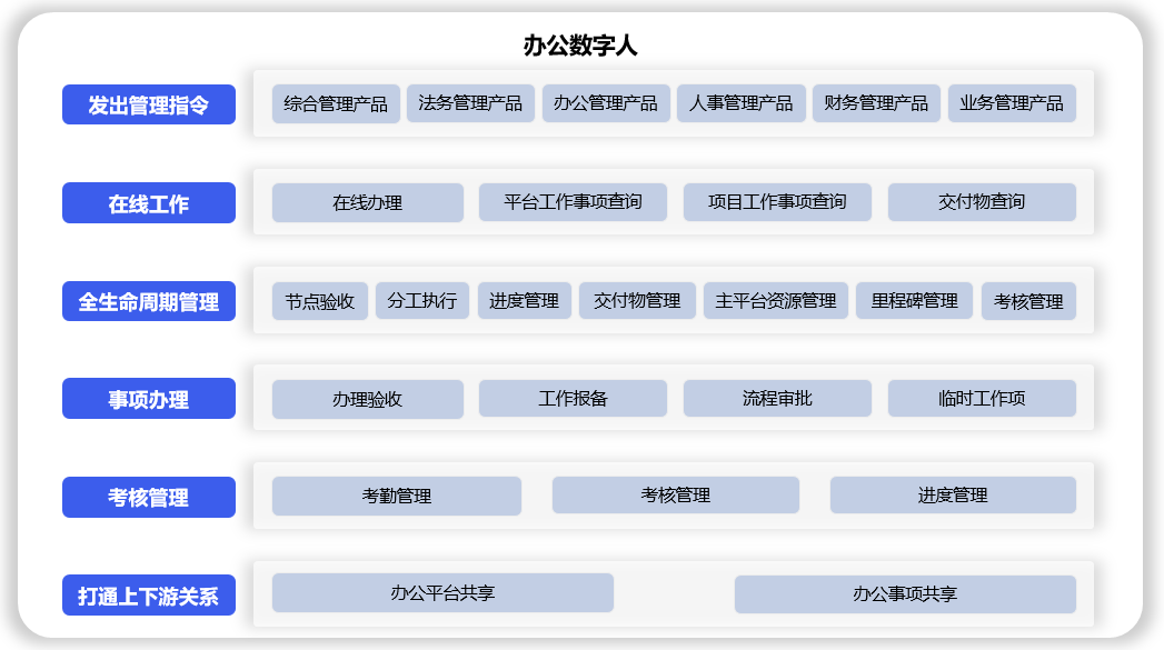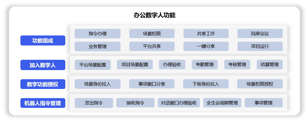 办公数字人功能由8个分类(指令办理、场景权限、共享工作、同屏会议、业务管理、平台共享、一键分享、项目运行)组成,用于: