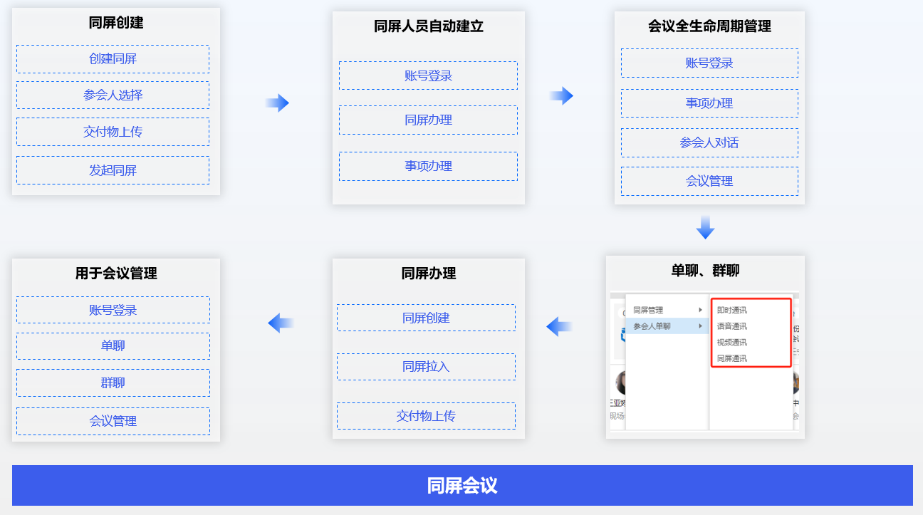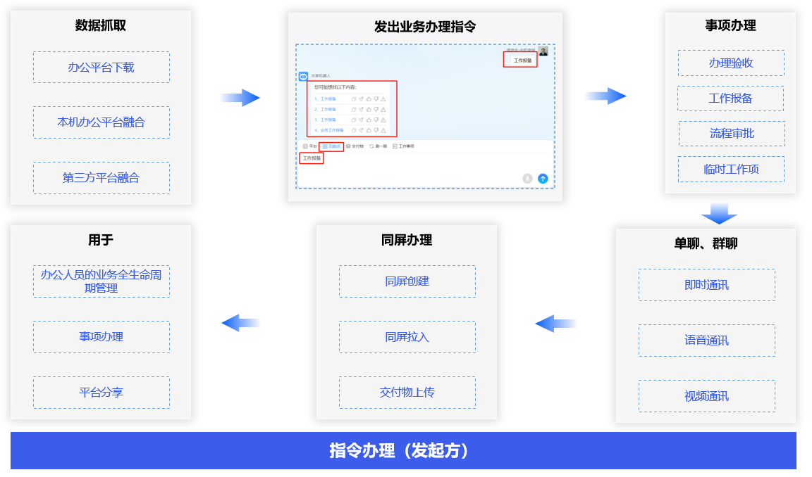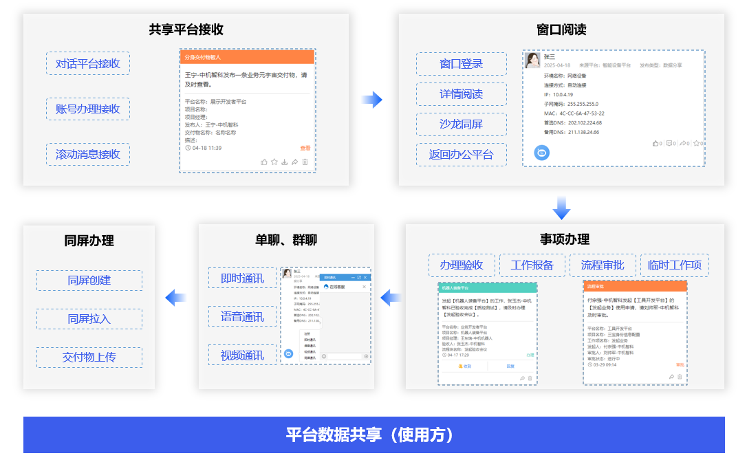 使用方接收待办事项,完成全生命周期管理和事项办理,还可以与平台方互动、单聊、群聊、同屏办理以及事项查询。