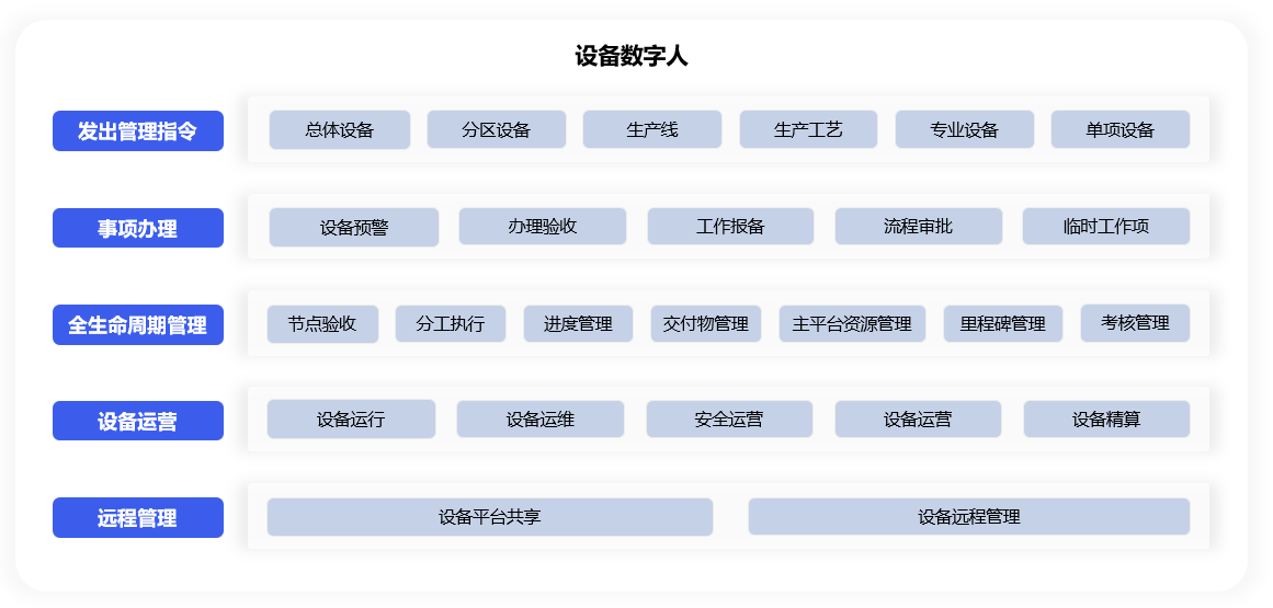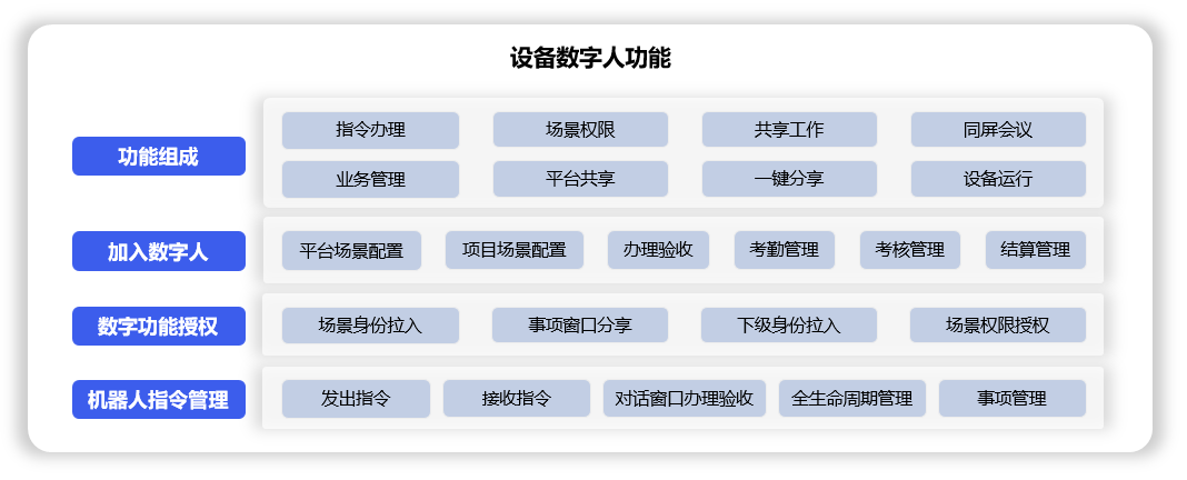 设备数字人功能由8个分类(指令办理、场景权限、共享工作、同屏会议、业务管理、平台共享、一键分享、设备运行)组成,用于: