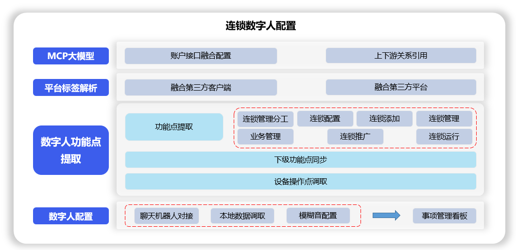 数字人MCP模型账户接口融合配置,上下游关系引用,通过对设备中融合过的客户端、平台进行标签解析,对连锁管理分工、连锁配置、连锁添加、连锁管理、业务管理、连锁推广、连锁运行等数字人功能点提取,下级功能点同步,设备操作点调取,聊天机器人对接,本地数据调取,模糊音配置,将现实自身能力映照到虚拟环境中。