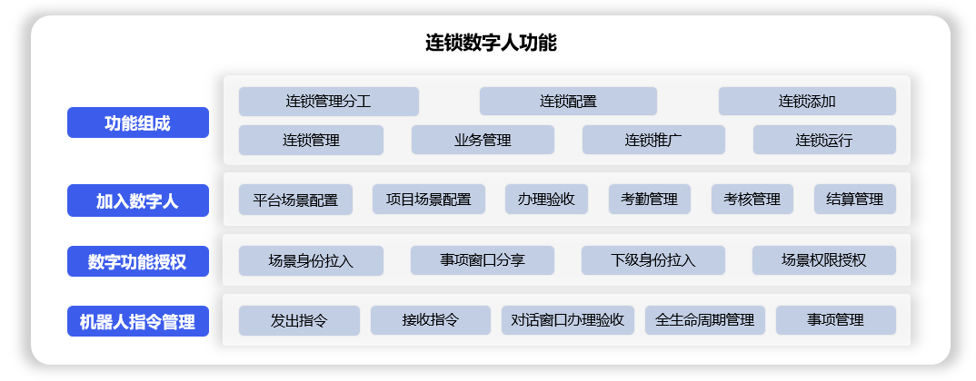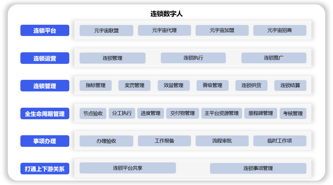 连锁数字人功能由7个分类(连锁管理分工、连锁配置、连锁添加、连锁管理、业务管理、连锁推广、连锁运行)组成,用于: