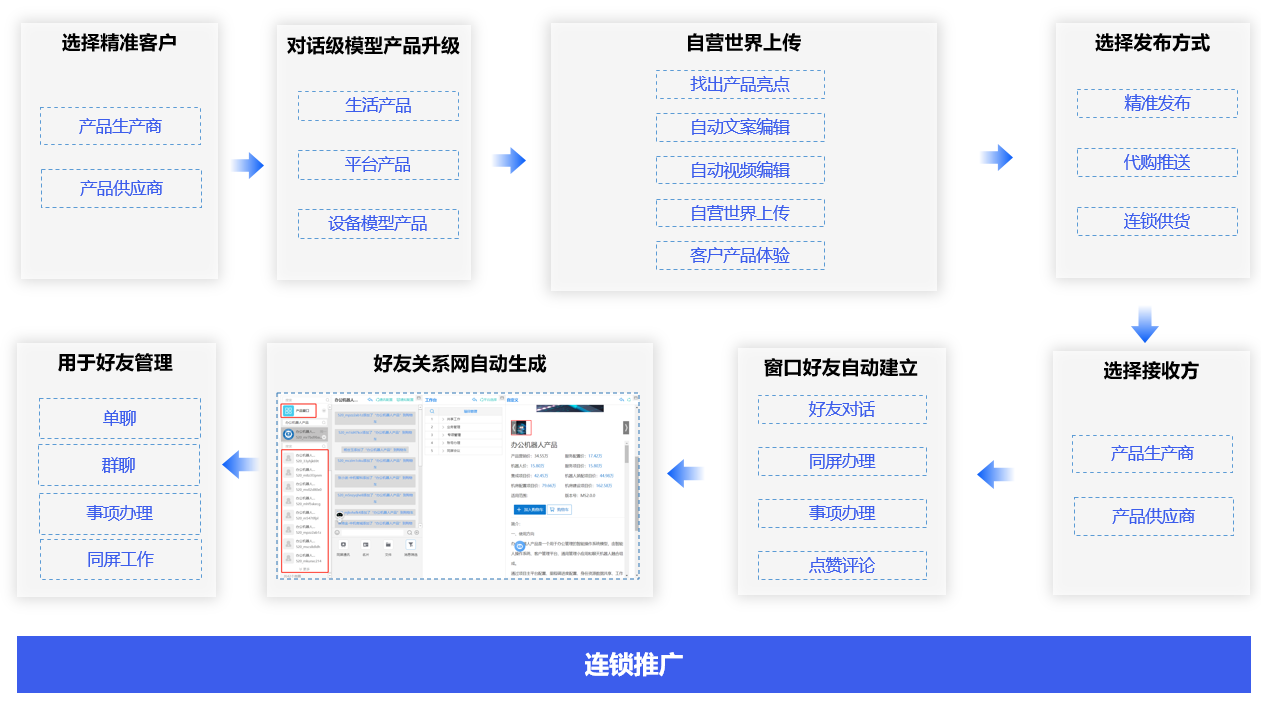 连锁推广不是产品营销,精准选择产品生产商和供应商,将其产品升级为对话级模型产品,再找出升级后的产品亮点,通过聊天机器人对推广产品进行文案、视频编辑。上传到共享世界用于客户了解和体验,同时还可以直接通过精准发布、代购推送、连锁供货,直接发送给产品生产商和供应商。