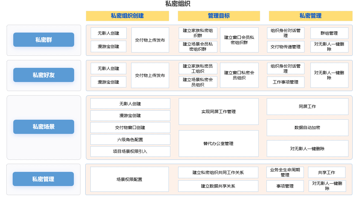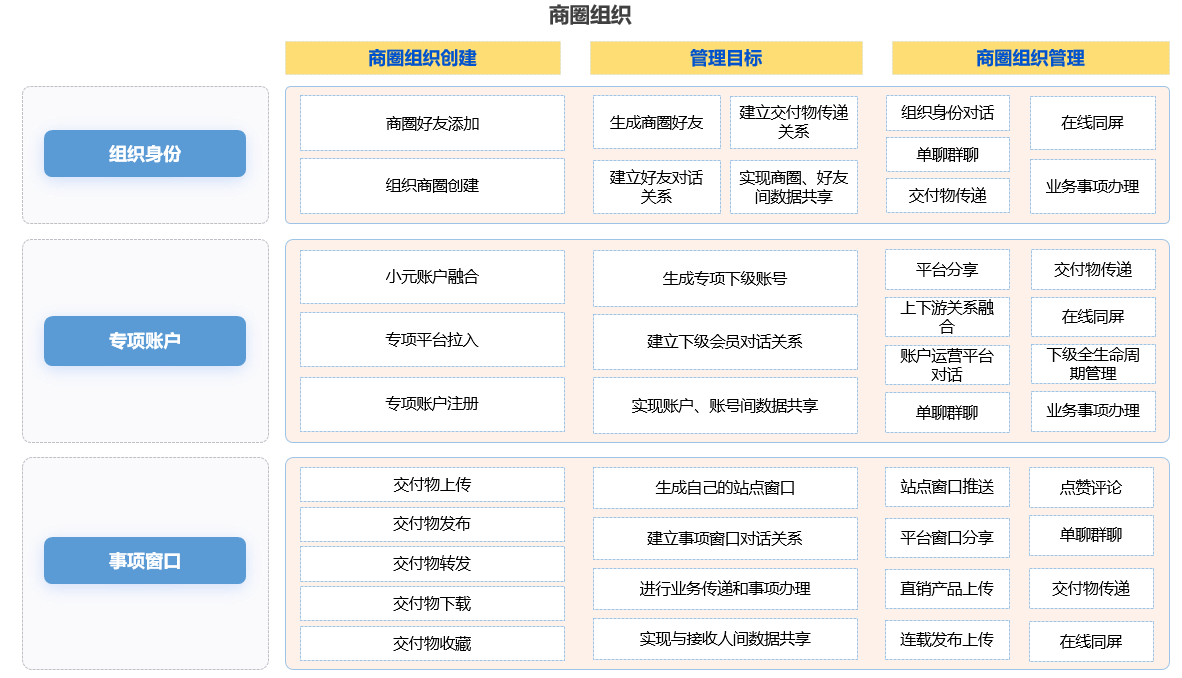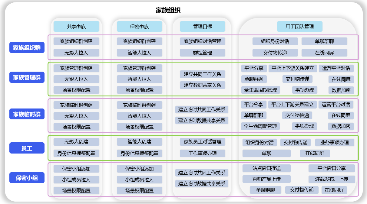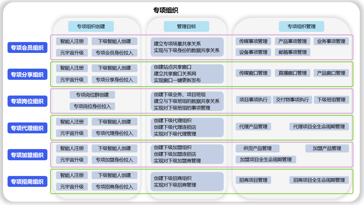 组织数字人功能由6个分类(商圈组织、家族组织、专项组织、私密组织、身份数据共享、平台数据共享)组成,用于: