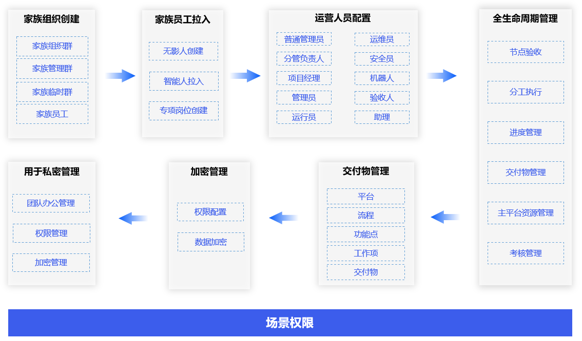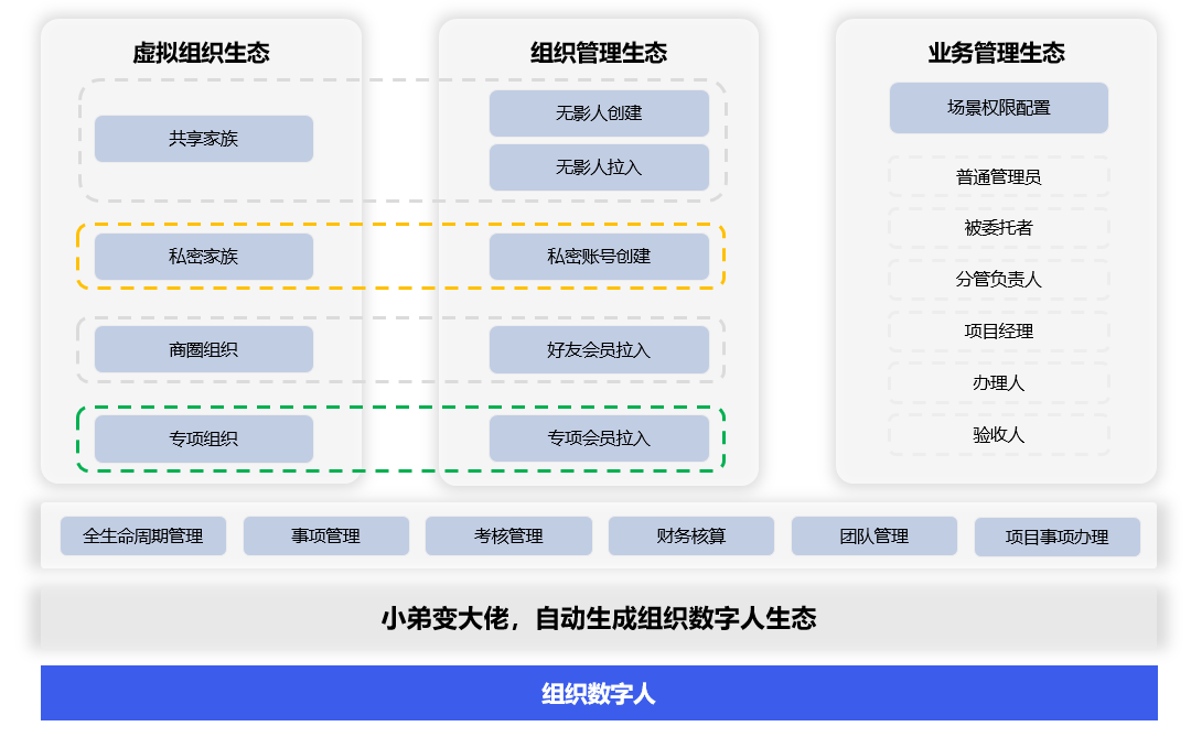 场景权限配置建立了业务共享管理生态,自动形成数字人的组织生态管理。