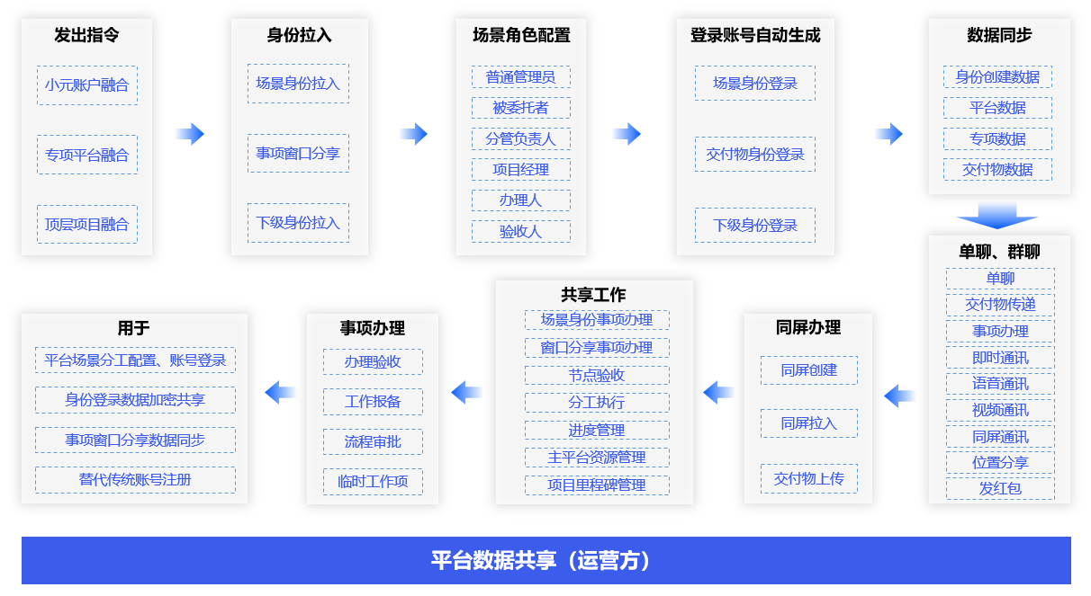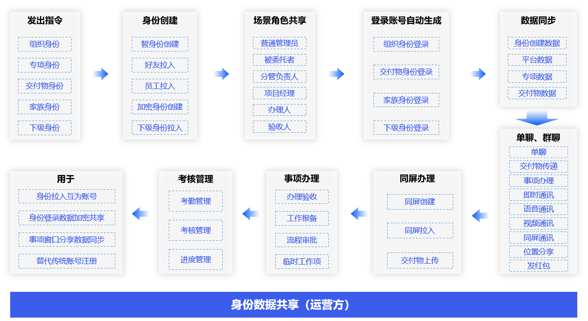 运营方借助共享管理机器人跨身份、跨平台、跨环境发出办理指令,工作人员会自动接收办理任务。通过组织身份拉入、窗口身份分享、场景配置、全生命周期管理、事项办理、考核管理、财务核算等操作生成生态登录账号,以用于跨身份、跨平台、跨环境管理。