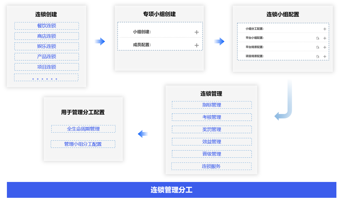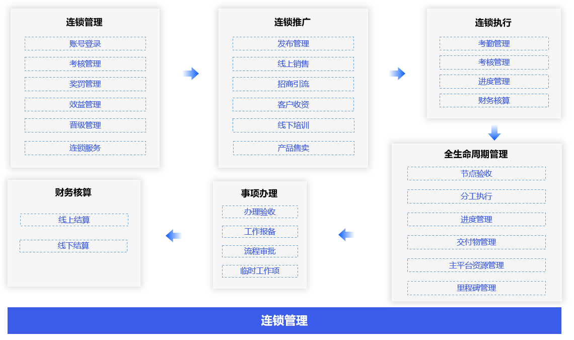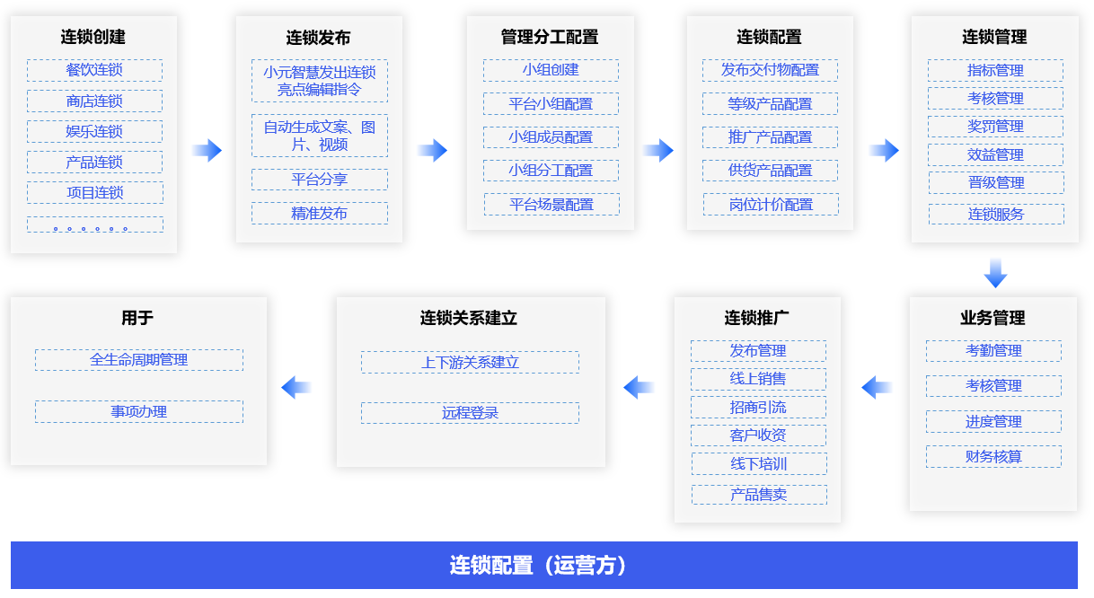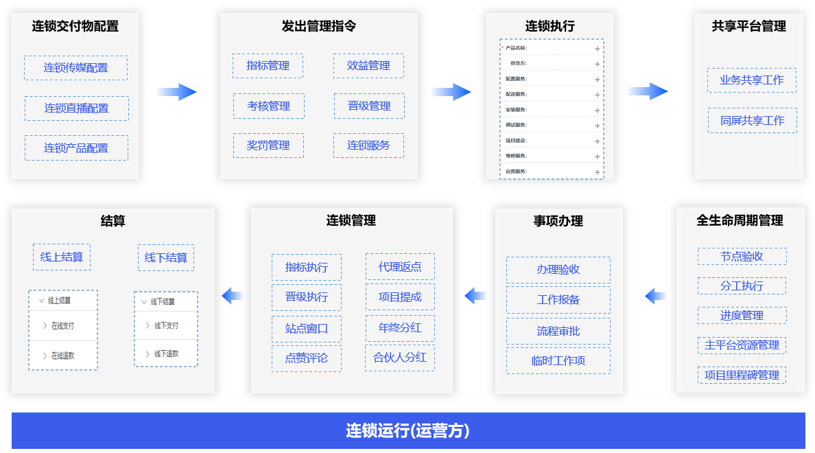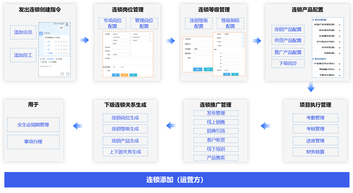 连锁成员拉入、岗位指标配置、连锁等级配置、考核指标配置、晋级指标配置、运行管理配置、执行管理配置、推广管理配置,实现对连锁成员的业务全生命周期管理、执行管理和推广管理。