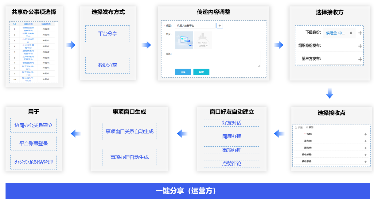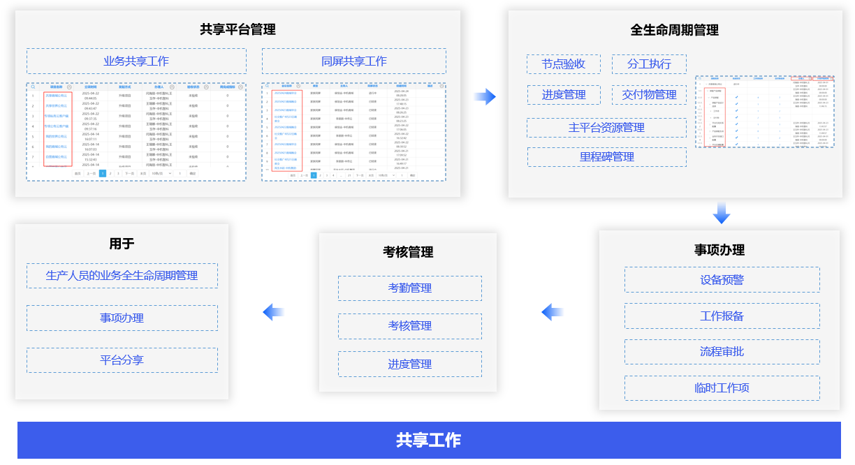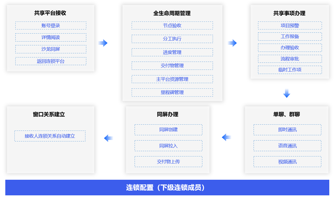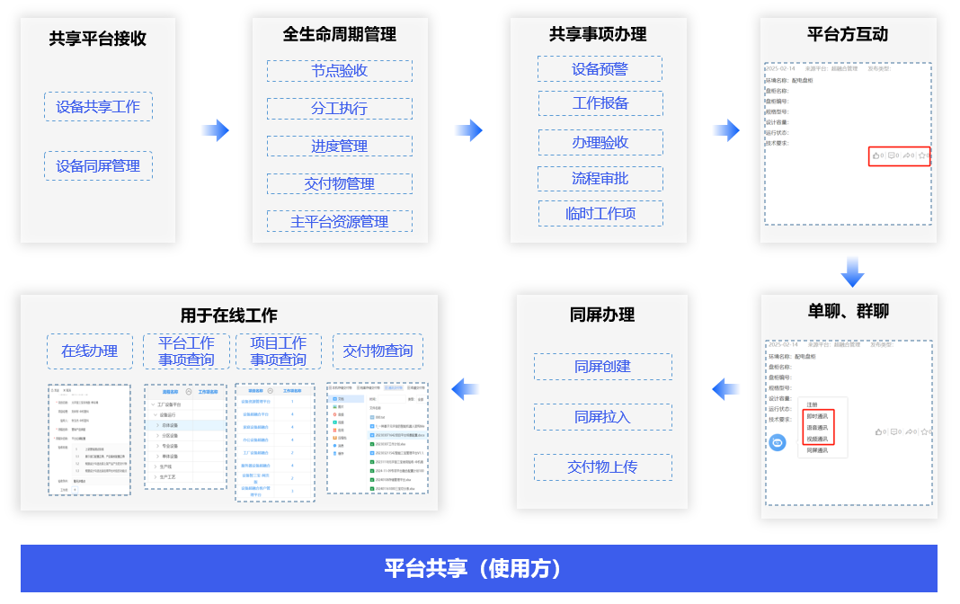 跨环境共享管理,通过共享工作平台,同步来自不同会员的设备平台的工作数据,直接进入对应的设备平台进行办理,对不同项目功能点和事项进行全生命周期管理。