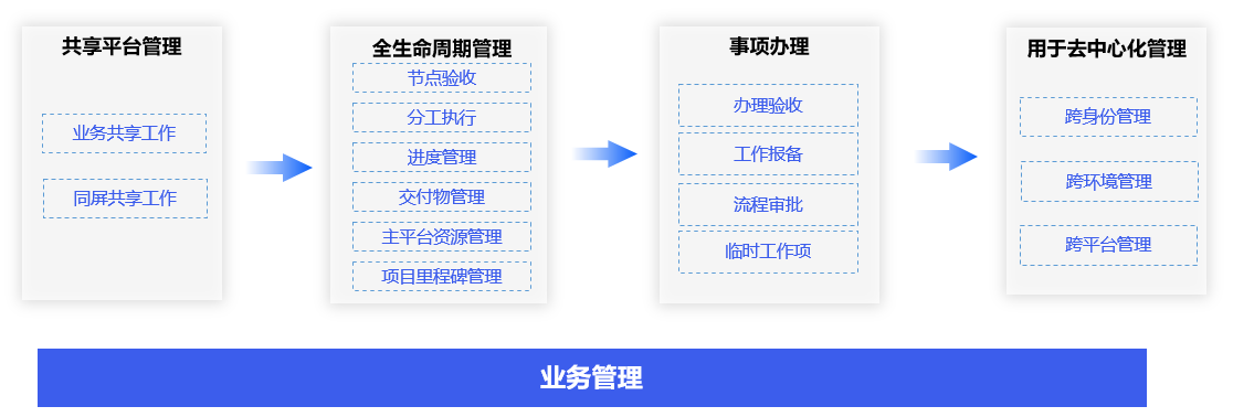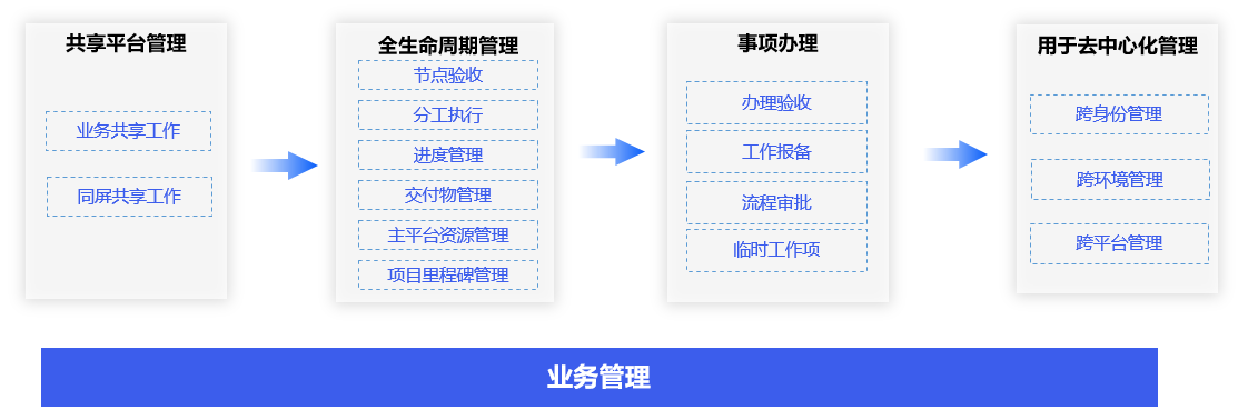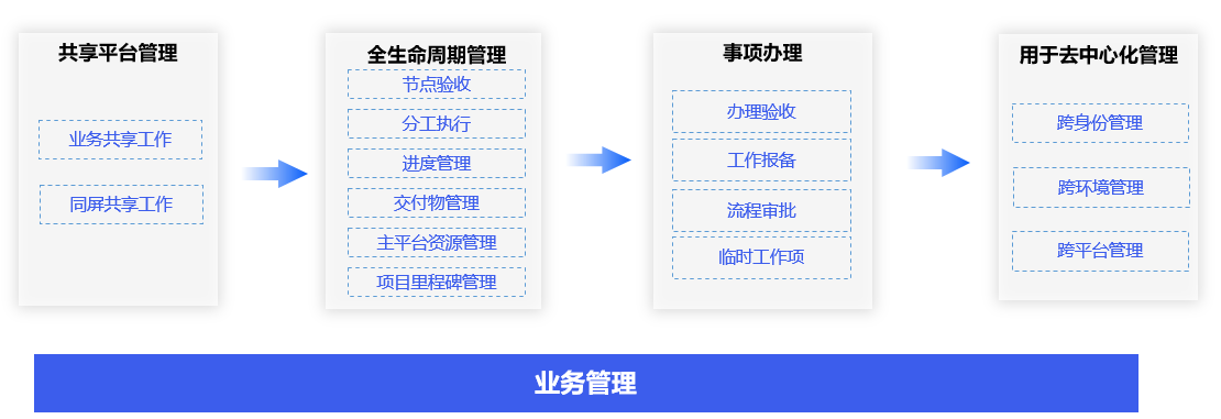 通过办公业务生态模型,自动建立对各类业务项目的过程验收、进度管理、全生命周期管理和事项管理,实现去中心化的跨身份、跨环境和跨平台管理。