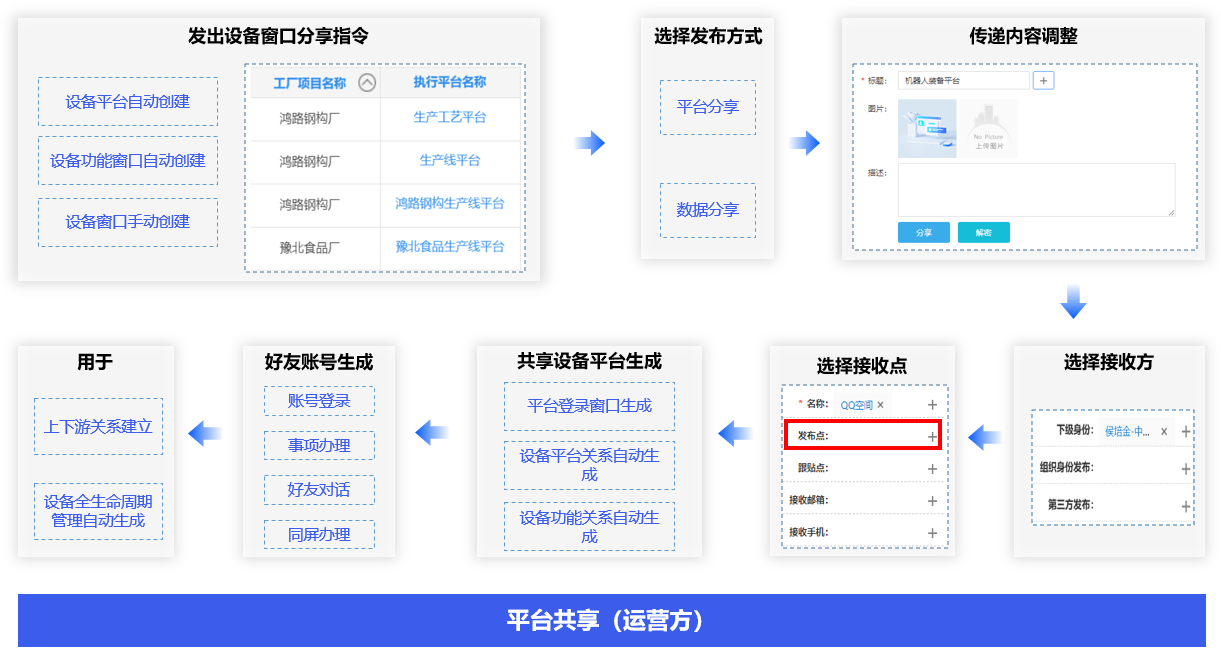 设备融合、下载、上下游引用关系建立、场景配置、设备平台、生产线平台、生产工艺平台的主平台资源配置、平台精算、设备数字人共享平台生成。