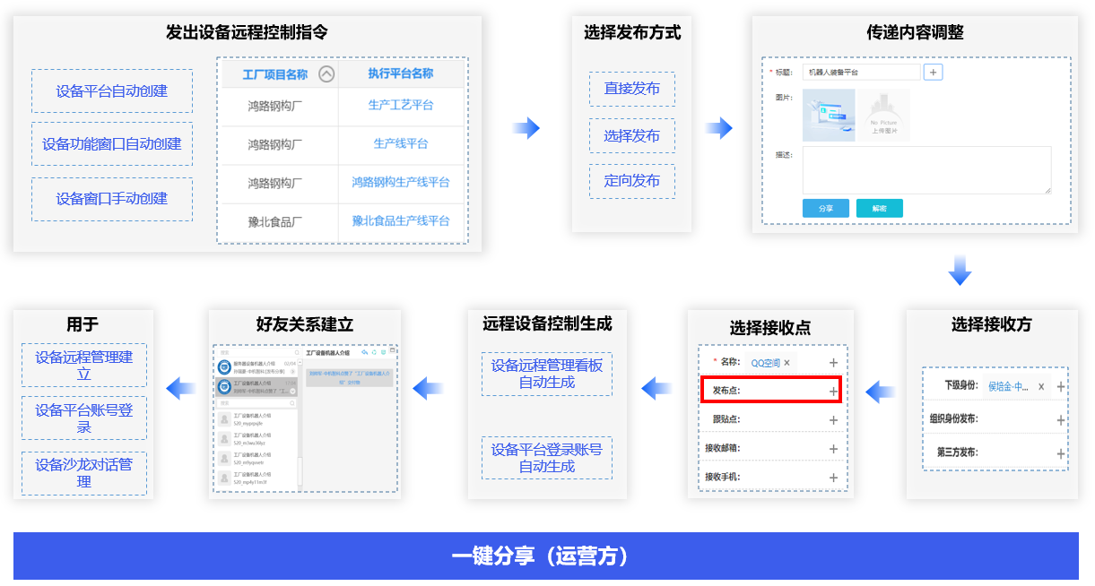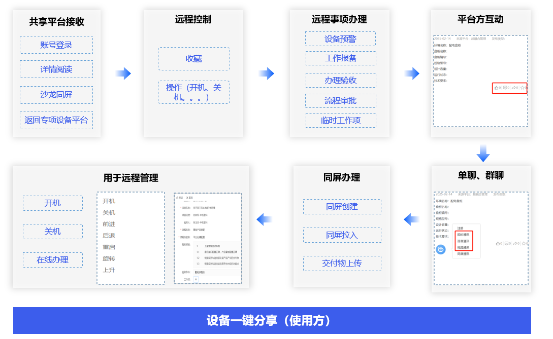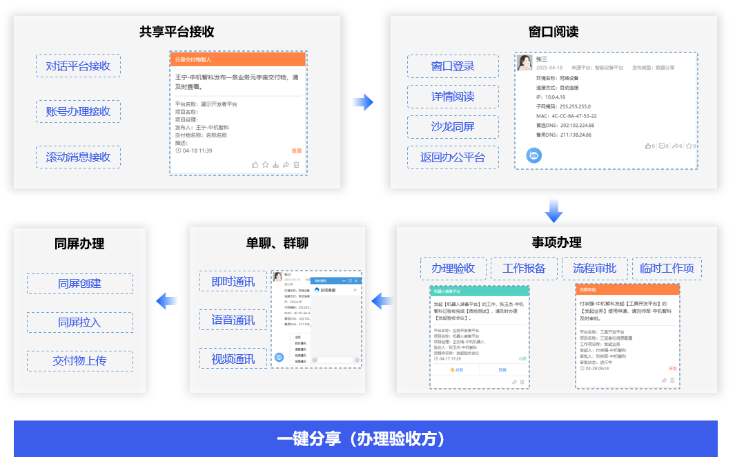 一键设备窗口分享,对话窗口管理,对来自不同环境、不同身份的所有设备平台的业务事项进行直接办理,不需要进入每一个设备,实现跨身份、跨环境设备融合。