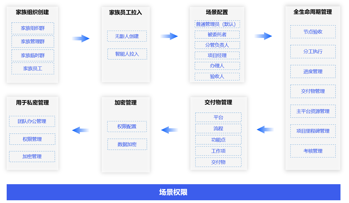 通过场景六级身份拉入(普通管理员、被委托者、分管负责人、项目经理、办理人、验收人)自动生成平台下级账号,对项目全生命周期下的所有交付物和工作项进行权限配置和数据加密,你将拥有一个属于自己的权限管理和加密管理办公生态。