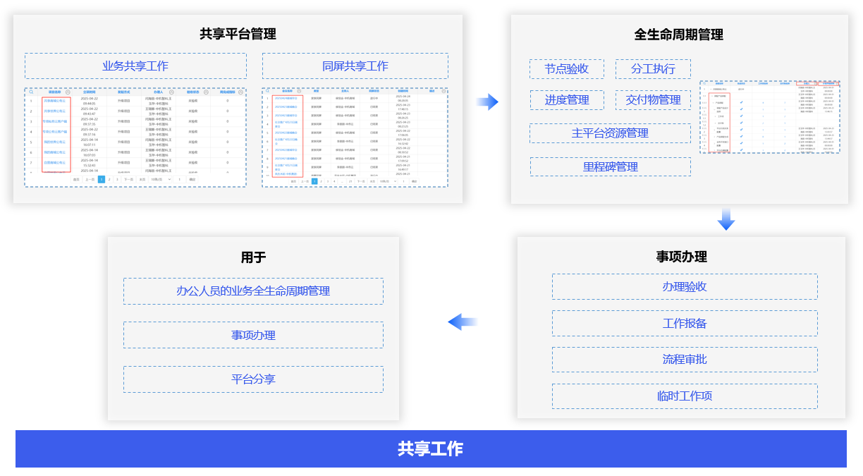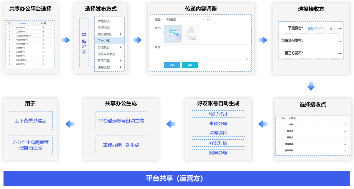 跨环境共享管理,通过共享工作平台,同步来自不同会员的应用平台的工作数据,直接进入对应的业务平台进行办理,对不同业务事项进行全生命周期管理。