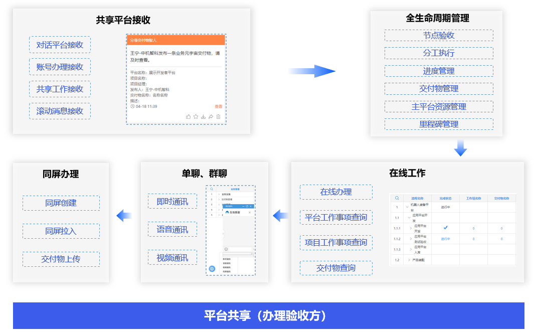 办理验收方则通过消息接收、消息办理、节点验收、分工执行、进度管理、交付物管理、主平台资源管理、考核管理、事项查询等操作,以体验平台事项管理。