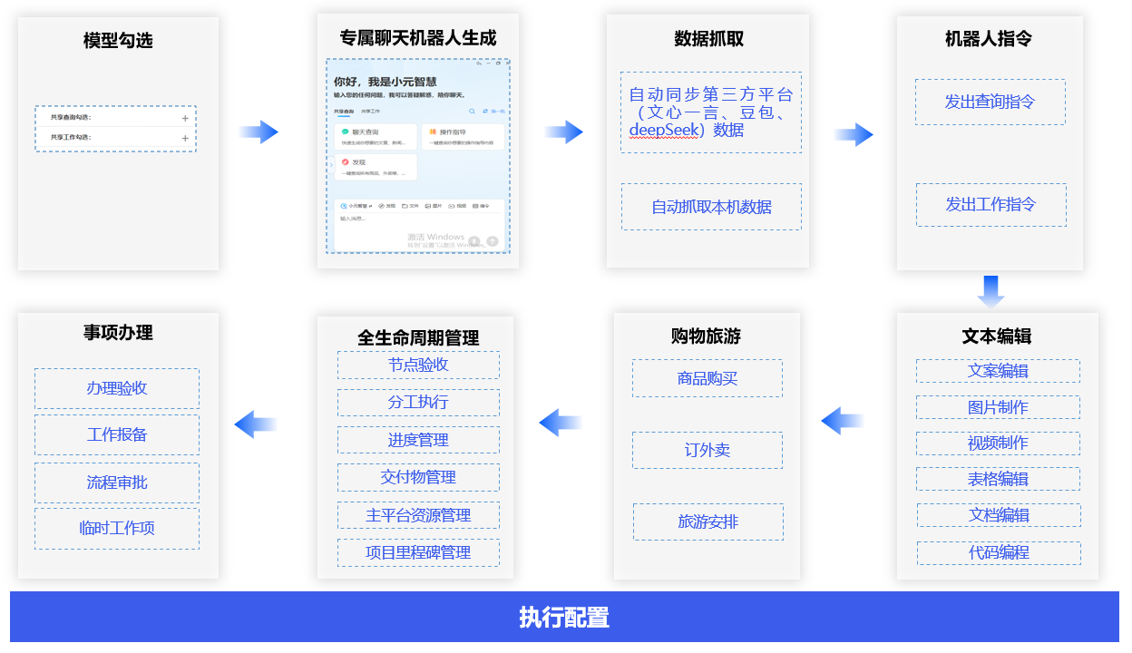 通过本机自营私密存储文件名称、提纲、关键词及应用平台的功能点、流程、流程块、工作项、交付物的数据解析和深度算法配置,与自己相关的共享查询、共享工作事项、功能点范围勾选,自动生成自己专属的小元智慧聊天机器人,小元智慧发出精准指令,调取第三方聊天机器人模型和本地数据,可以自动查询,编辑出自己需要的文案,视频。还可以对来自不同身份,不同环境的业务进行全生命周期管理和事项办理。