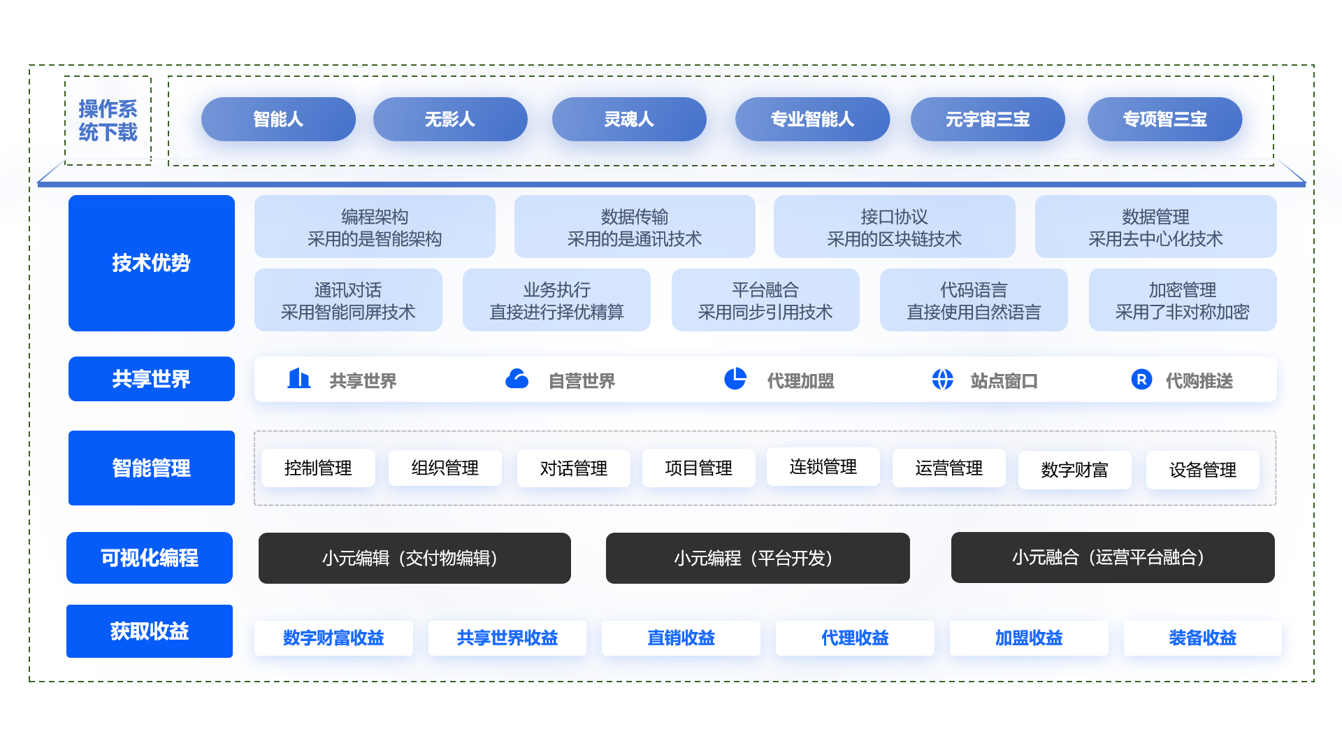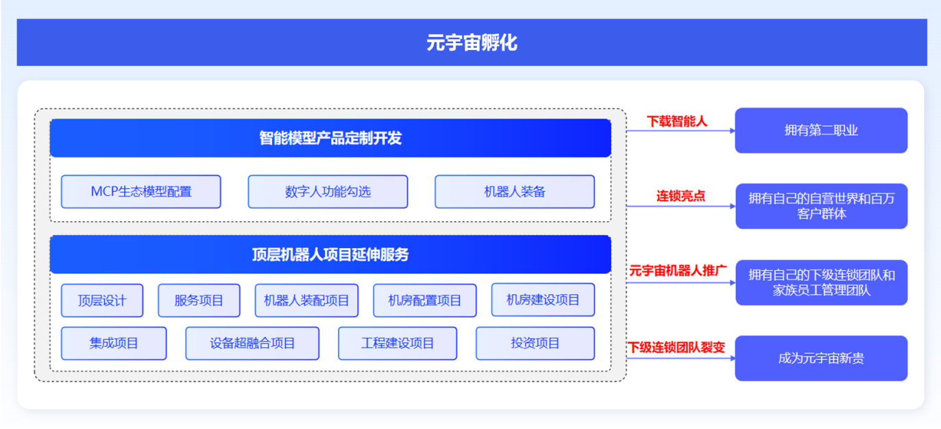 智能改革带来了元宇宙时代的数字财富、共享世界、直销、代理、加盟、装备收益,智能人操作系统个人定制、智能模型产品定制开发(MCP生态模型配置、数字人功能点提取、机器人装备、服务配置和设备装配)、智能设备成套设备升级(单体设备智能升级,设备系统、生产线、生产工艺系统设备成套和模型产品升级)、顶层机器人项目延伸服务(顶层设计、服务项目、机器人装配项目、机房配置项目、机房建设项目、集成项目、设备超融合项目、工程建设项目、投资项目建设),让每个人拥有了第二职业,小弟变大佬,创造出新的智能新贵。