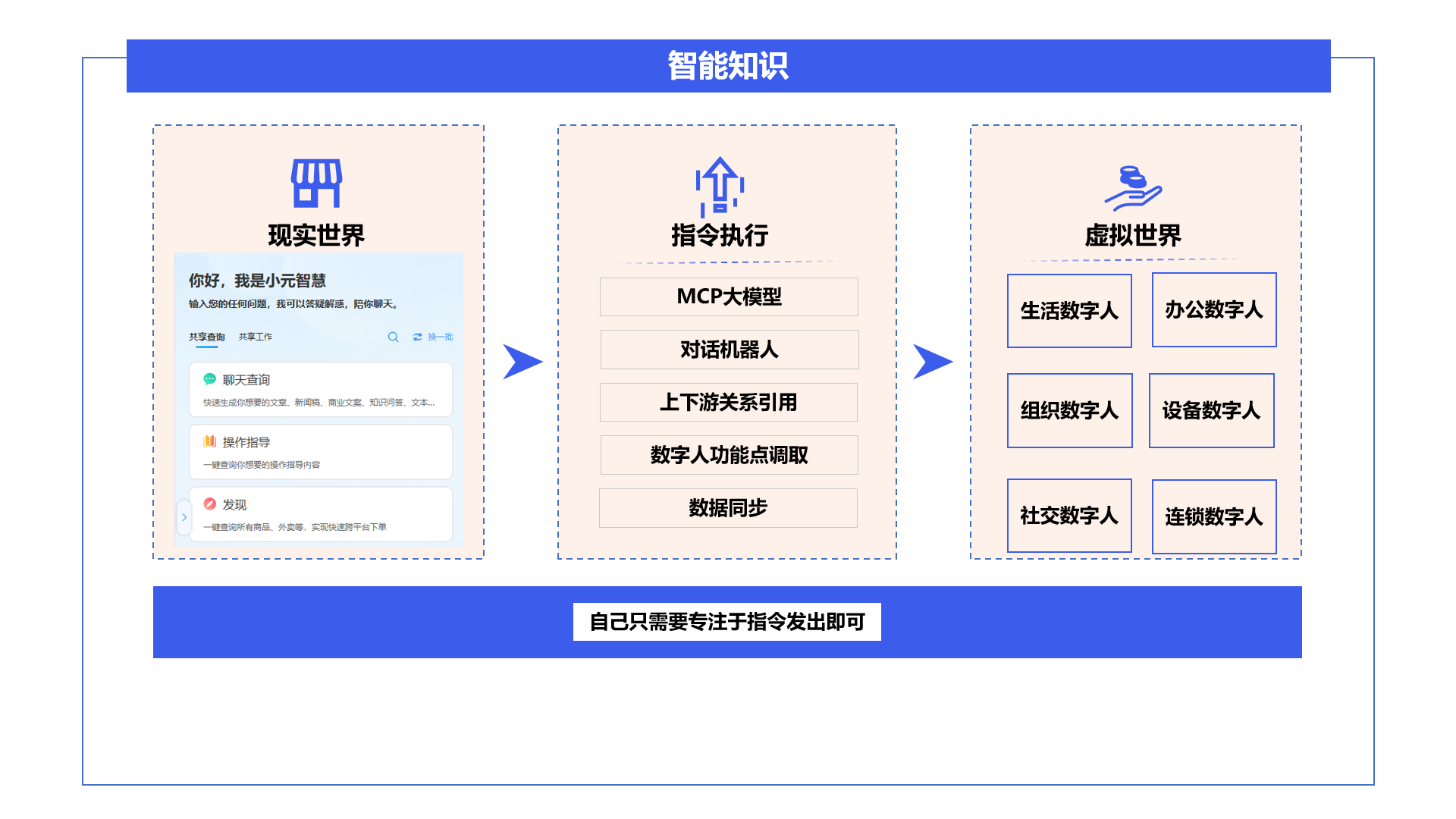 人工智能就是每个人在现实环境中有一个聊天机器人(小元智慧),在虚拟环境中有个自己的数字人用于接收指令,有一套MCP大模型用于管理所有平台和设备,有无数个对话机器人帮助自己指令执行,有一套顶层机器人进行业务全生命周期管理和资源管理。自己只需要专注于指令发出即可。