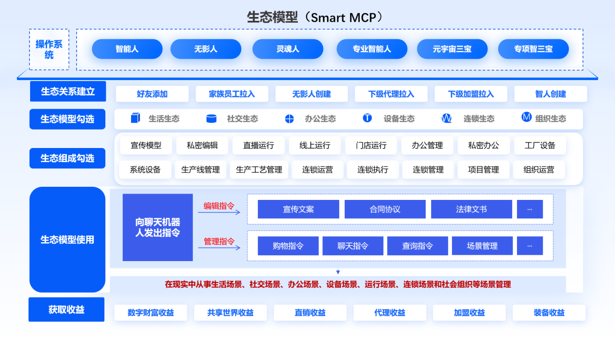 a智能生态模型协议(Smart Model Context Protocol),简称生态模型(Smart MCP):下载到自己与自己相关会员设备中的生活管理、社交管理、办公管理、工厂管理、连锁管理和组织管理等账户客户端、平台接口融合配置,跨身份、跨平台数据调用自动生成组织身份统计管理、事项办理大看板;再将融合过的客户端、平台之间建立上下游引用关系,自动生成业务管理、设备系统管理、生产线管理、生产工艺管理全生命周期管理和事项办理、操作执行大看板;增加了小元智慧聊天机器人和本地查询,小元智慧发出管理指令,数字人接收指令,机器人落地办理,它不但可以代替自己编辑和查询各类文件,还可以在现实中从事生活场景、社交场景、办公场景、设备场景、运行场景、连锁场景和社会组织等场景管理,实现无人办公和黑灯工厂。