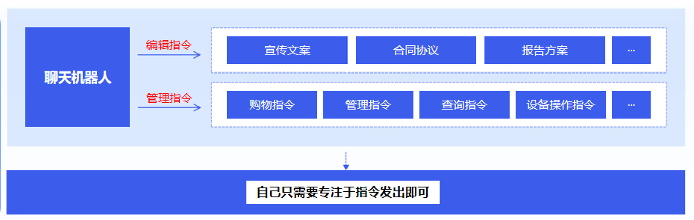b聊天机器人发出指令:专业机器人接收指令,自动调取生活、社交、办公、设备、连锁、组织各类功能点代替自己生活、学习和工作;