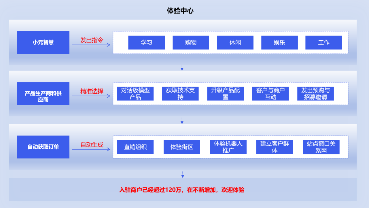 b体验中心可以通过精准选择产品生产商和供应商,将其产品升级为对话级模型产品,提供完整的产品升级配置,包括获取技术支持、升级产品配置、小元智慧指令体验、客户与商户互动、发出预购与招募邀请。再找出升级后的产品亮点,通过机器人聊天对推广产品进行文案、视频编辑。上传到共享世界用于客户了解和体验,同时还可以直接通过精准发布、代购推送、连锁供货,直接发送给产品生产商和供应商。