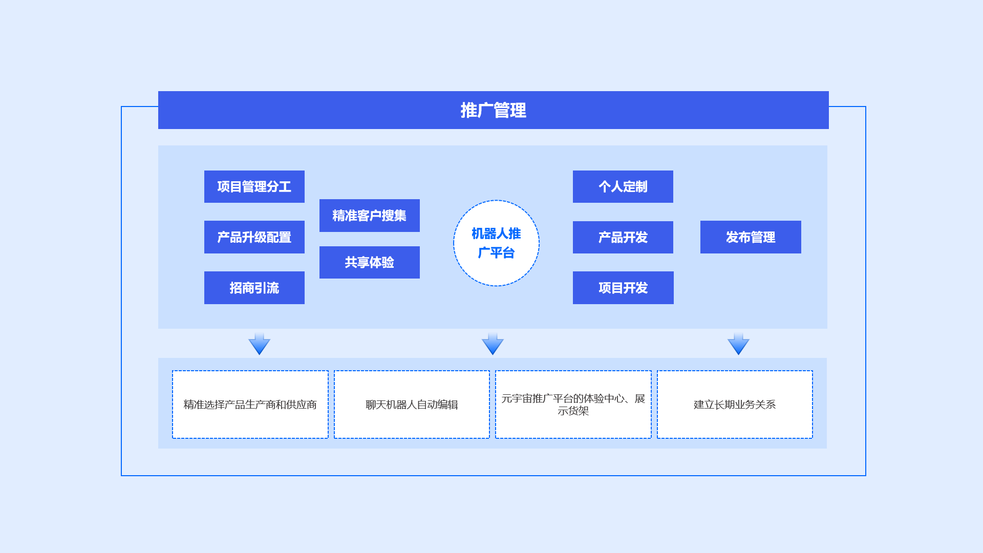 c用于推广项目的全生命周期管理:为了确保每一个发出的推广事项都能被关注、答复、引流、签约,建立长期的业务关系,机器人推广平台由项目管理分工、精准客户搜集、产品升级配置、共享体验、招商引流、发布管理、个人定制、产品开发、项目开发组成。