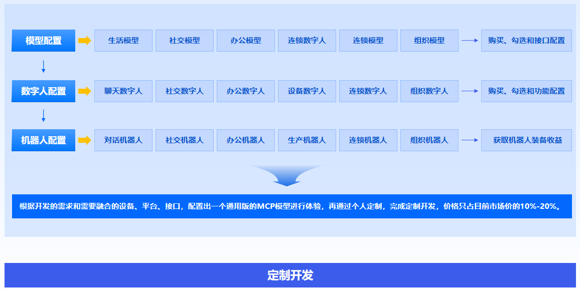 MCP生态大模型配置、数字人功能点提取、聊天机器人对接、机器人装备和服务配置、顶层机器人打通上下游关系、主平台和里程碑平台资源配置、生成的人工智能全智能管理大看板,共同组成了定制开发的业务管理全过程。