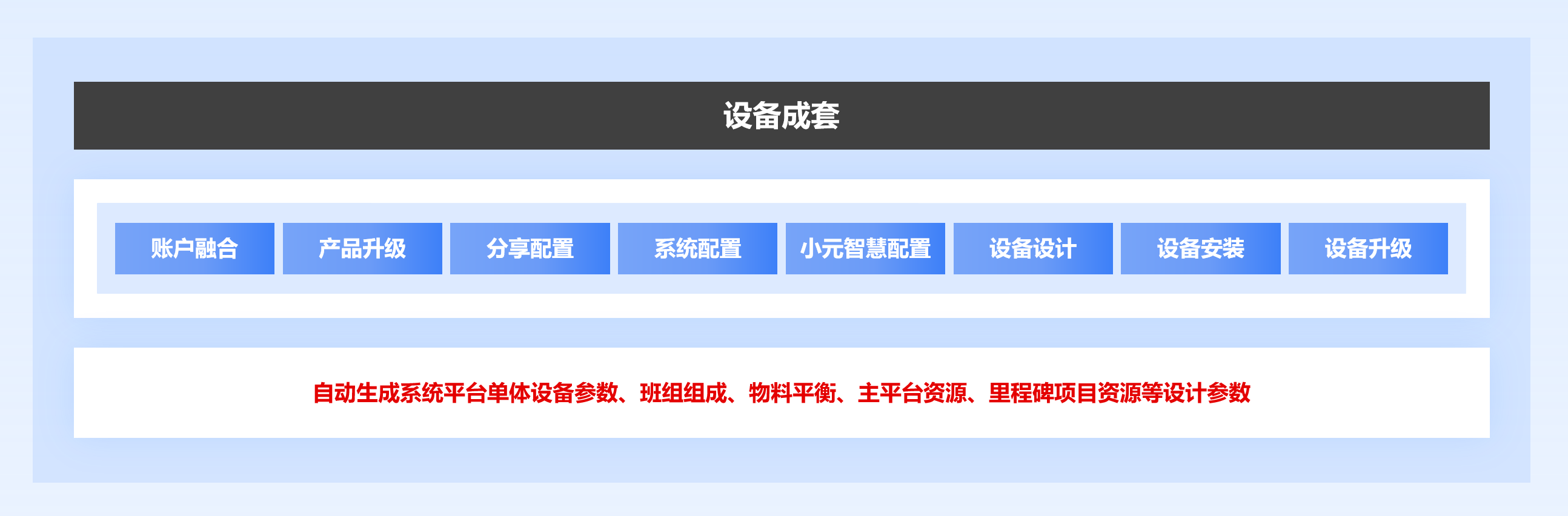 设备成套是在MCP生态大模型配置、数字人功能点提取、聊天机器人对接、机器人装备和服务配置、顶层机器人打通上下游关系、主平台和里程碑平台资源配置,生成的人工智能全智能管理大看板的基础上,通过预设系统设备产能消耗配置,生产线设备、人力、物料产能消耗配置,生产工艺设备、人力、物料产能消耗配置和委托外部加工,平台择优精算,主平台资源配置,里程碑平台资源配置,自动生成系统平台单体设备参数、班组组成,物料平衡、主平台资源、里程碑项目资源等设计参数,这些参数可直接用于设备采购、班组组建、物料购买、存储、管理、委外加工和生产业务的全生命周期管理,也可用于设备系统、生产线、生产工艺项目设计,是集成项目、超融合项目、设备安装、EPC总承包等项目总承包的组成部分,拥有了某一个专业的设备成套,就等同于拥有了这个专业的设备生产、系统管理标准和提供设备成套及项目建设总承包的权力。