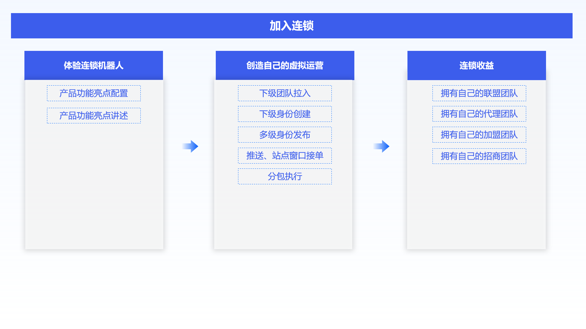 对客户进行连锁机器人产品的功能亮点配置和讲述,引导客户体验连锁机器人带来的价值和功能,通过下级团队拉入,下级身份创建,多级身份发布、推送、站点窗口接单,分包执行,帮助客户创造出自己的虚拟运营,拥有自己的联盟、代理、加盟、招商团队,赚取元宇宙带来的连锁收益。