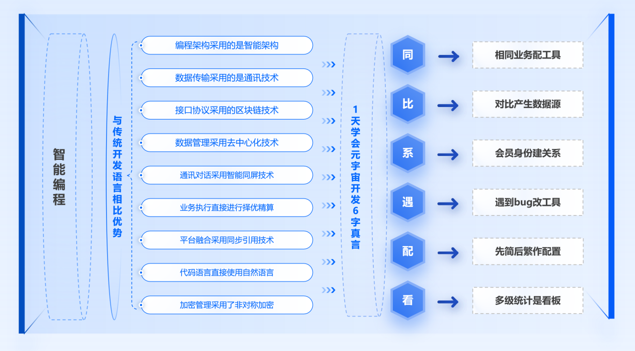 优势:1天学会元宇宙开发6字真言,同、比、系、遇、配、看,迅速成为新时代的开发大师;你可以不会,也可以不懂,对话机器人代替你进行编程,仅需要传统代码开发1%的时间。