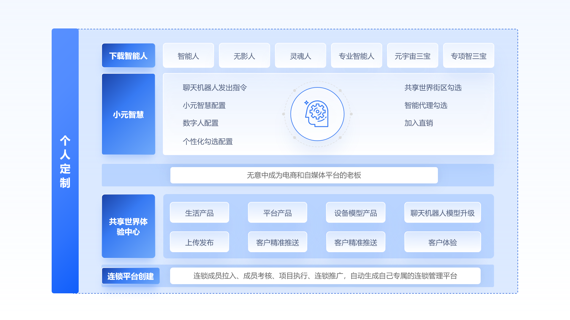j共享世界体验中心:生活产品、平台产品、设备模型产品,人工智能聊天机器人模型升级、上传发布、客户精准推送,客户体验、自动生成自己专属的共享世界体验中心;